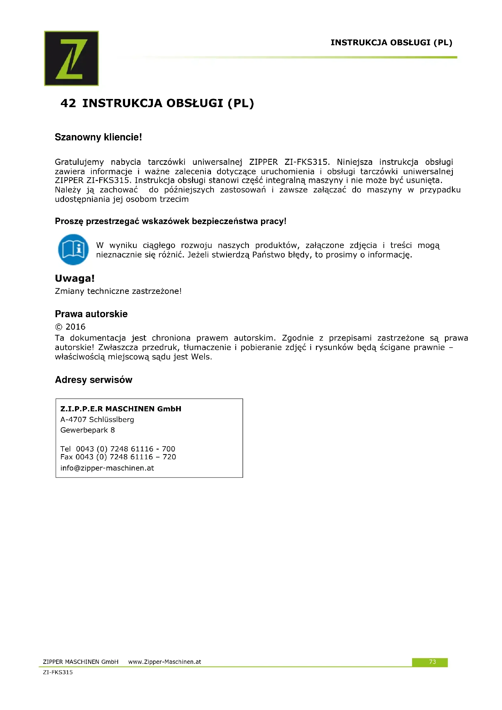 K vyklopení podvozku vně nejprve pilu lehce nadzvedněte a podvozek 15 vytáhněte. Nyní stroj opět položte. Nyní s pomocí rukojeí 16 můžete stroj lehce přemísťovat. Důležité: Nikdy stroj nezvedejte za posuvný stůl. Důležité: Po přemístění podvozek opět zasuňte pod stroj, abyste zajistili bezpečnou polohu stroje. K tomu postupujte opačně.INSTRUKCJA OBSŁUGI (PL) ZIPPER MASCHINEN GmbH www.Zipper-Maschinen.at 73 ZI-FKS315 42 INSTRUKCJA OBSŁUGI (PL) Szanowny kliencie! Gratulujemy nabycia tarczówki uniwersalnej ZIPPER ZI-FKS315. Niniejsza instrukcja obsługi zawiera informacje i ważne zalecenia dotyczące uruchomienia i obsługi tarczówki uniwersalnej ZIPPER ZI-FKS315. Instrukcja obsługi stanowi część integralną maszyny i nie może być usunięta. Należy ją zachować do późniejszych zastosowań i zawsze załączać do maszyny w przypadku udostępniania jej osobom trzecim Proszę przestrzegać wskazówek bezpieczeństwa pracy! W wyniku ciągłego rozwoju naszych produktów, załączone zdjęcia i treści mogą nieznacznie się różnić. Jeżeli stwierdzą Państwo błędy, to prosimy o informację. Uwaga! Zmiany techniczne zastrzeżone! Prawa autorskie © 2016 Ta dokumentacja jest chroniona prawem autorskim. Zgodnie z przepisami zastrzeżone są prawa autorskie! Zwłaszcza przedruk, tłumaczenie i pobieranie zdjęć i rysunków będą ścigane prawnie – właściwością miejscową sądu jest Wels. Adresy serwisów