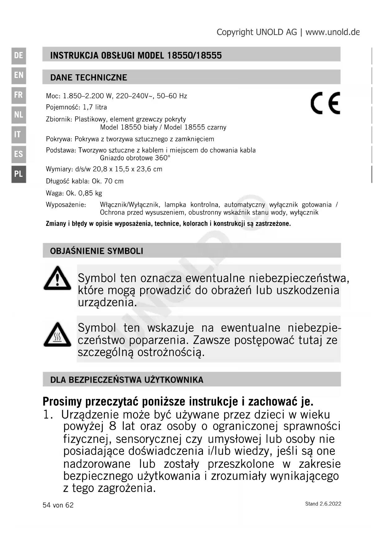 powyżej 8 lat oraz osoby o ograniczonej sprawności fizycznej, sensorycznej czy umysłowej lub osoby nie posiadające doświadczenia i/lub wiedzy, jeśli są one nadzorowane lub zostały przeszkolone w zakresie bezpiecznego użytkowania i zrozumiały wynikającego z tego zagrożenia. Copyright UNOLD AG | www.unold.de UNOLD ©Stand 2.6.2022 55 von 62
