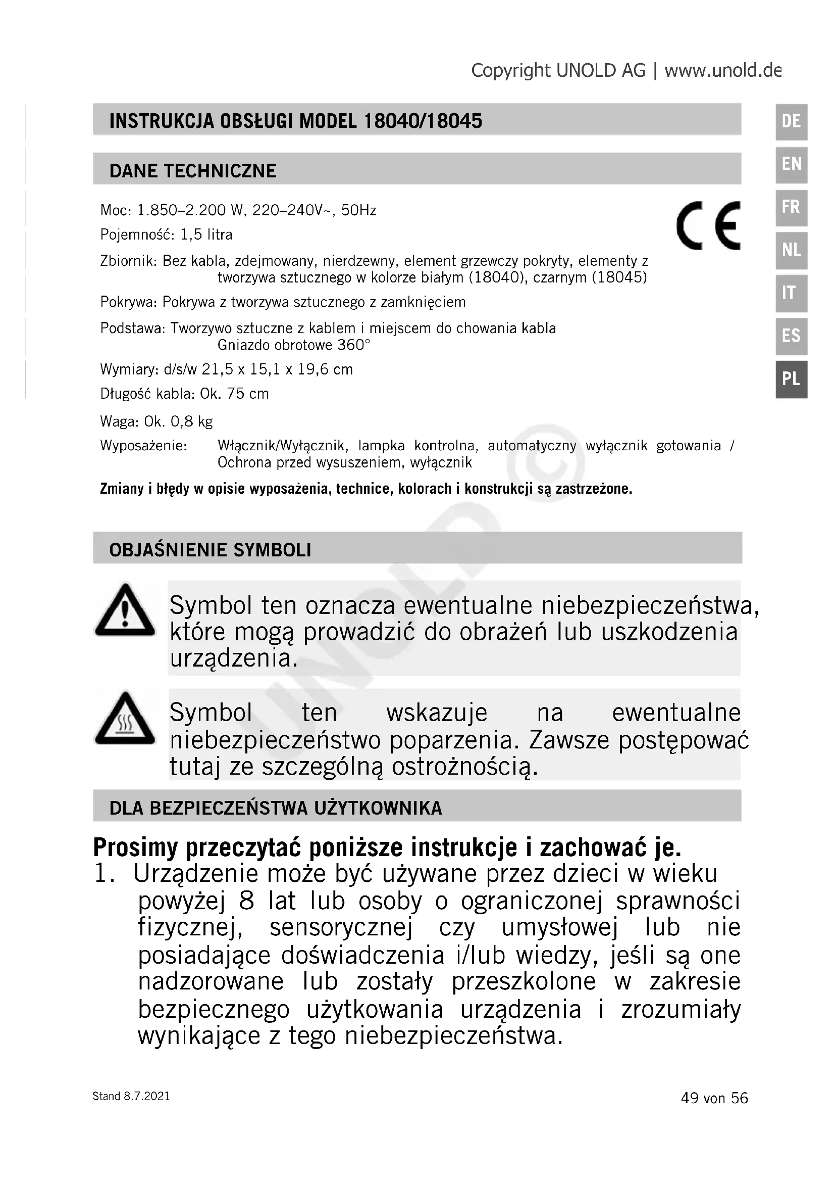 niebezpieczeństwo dla użytkowników i prowadzą do wygaśnięcia gwarancji. Copyright UNOLD AG | www.unold.de UNOLD ©52 von 56 Stand 8.7.2021