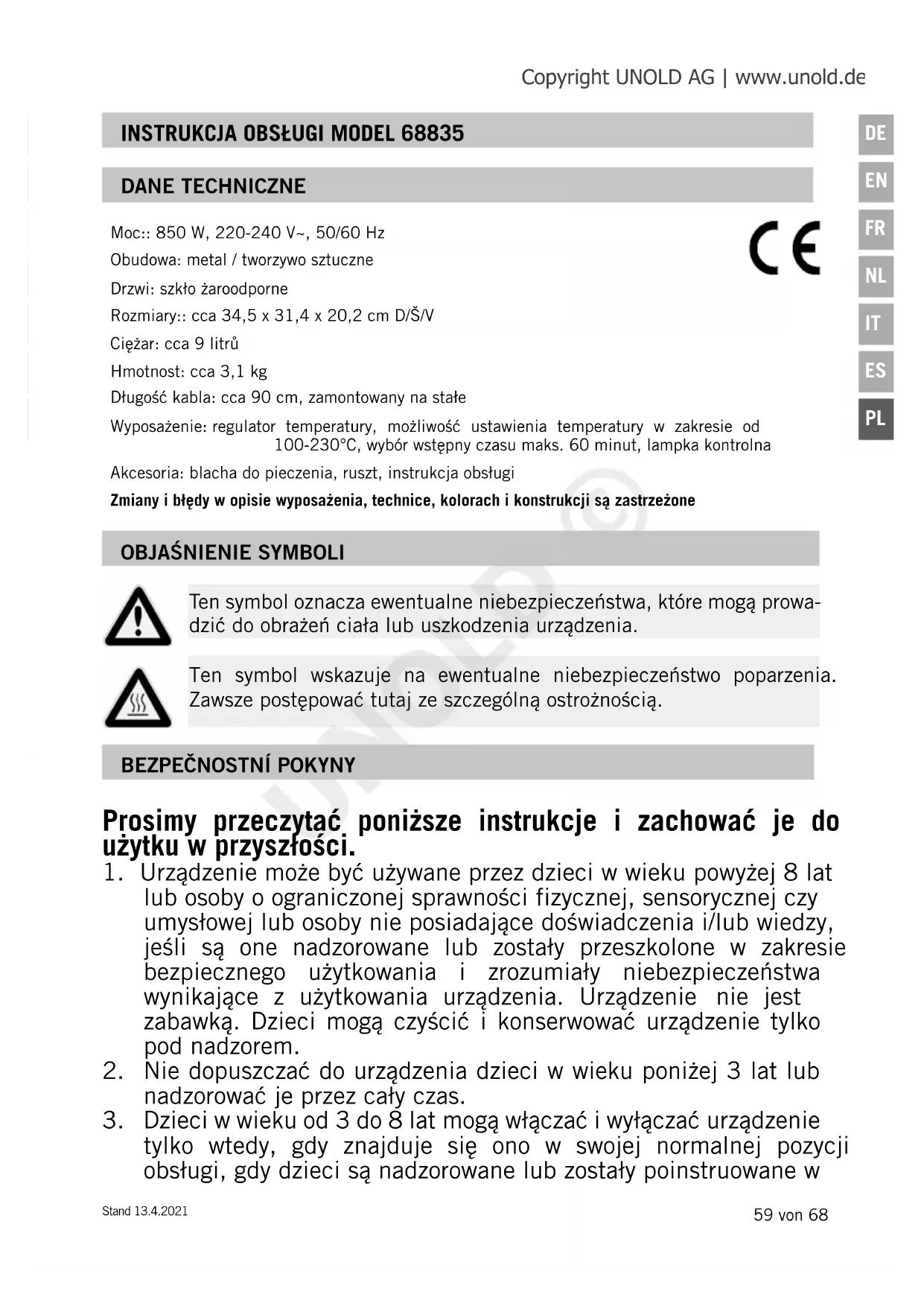 Ten symbol oznacza ewentualne niebezpieczeństwa, które mogą prowa- dzić do obrażeń ciała lub uszkodzenia urządzenia. Ten symbol wskazuje na ewentualne niebezpieczeństwo poparzenia. Zawsze postępować tutaj ze szczególną ostrożnością. Copyright UNOLD AG | www.unold.de UNOLD ©60 von 68 Stand 13.4.2021