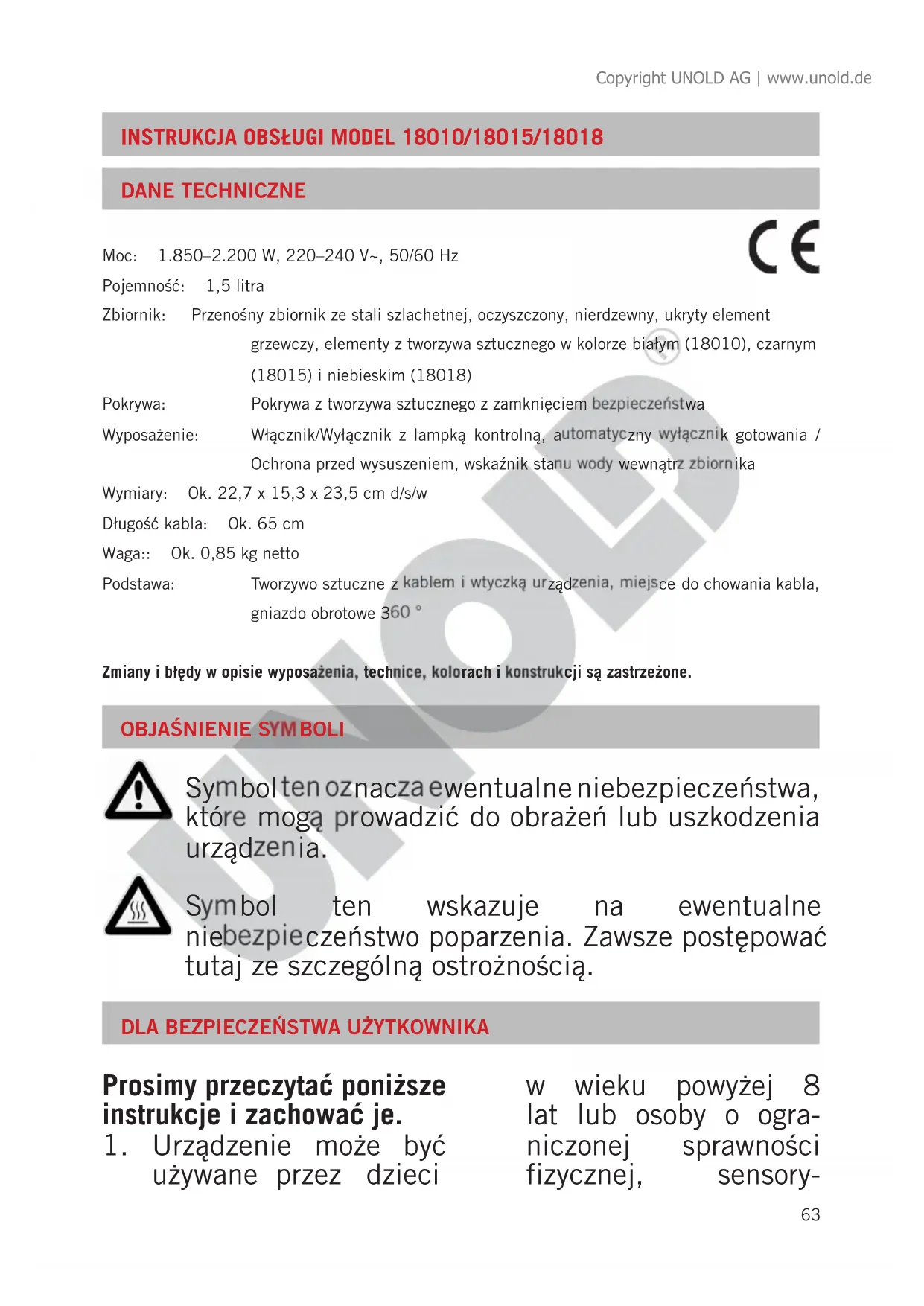 używane przez dzieci w wieku powyżej 8 lat lub osoby o ogra- niczonej sprawności fizycznej, sensory- Copyright UNOLD AG | www.unold.de64 cznej czy umysłowej lub nie posiadające doświadczenia i/ lub wiedzy, jeśli są one nadzorowane lub zostały przeszkolone w zakresie bezpie- cznego użytkowania urządzenia i zrozumiały wynikające z tego niebezpieczeństwa. Urządzenie nie jest zabawką. Dzieci mogą czyścić i konserwować urządzenie tylko pod nadzorem.