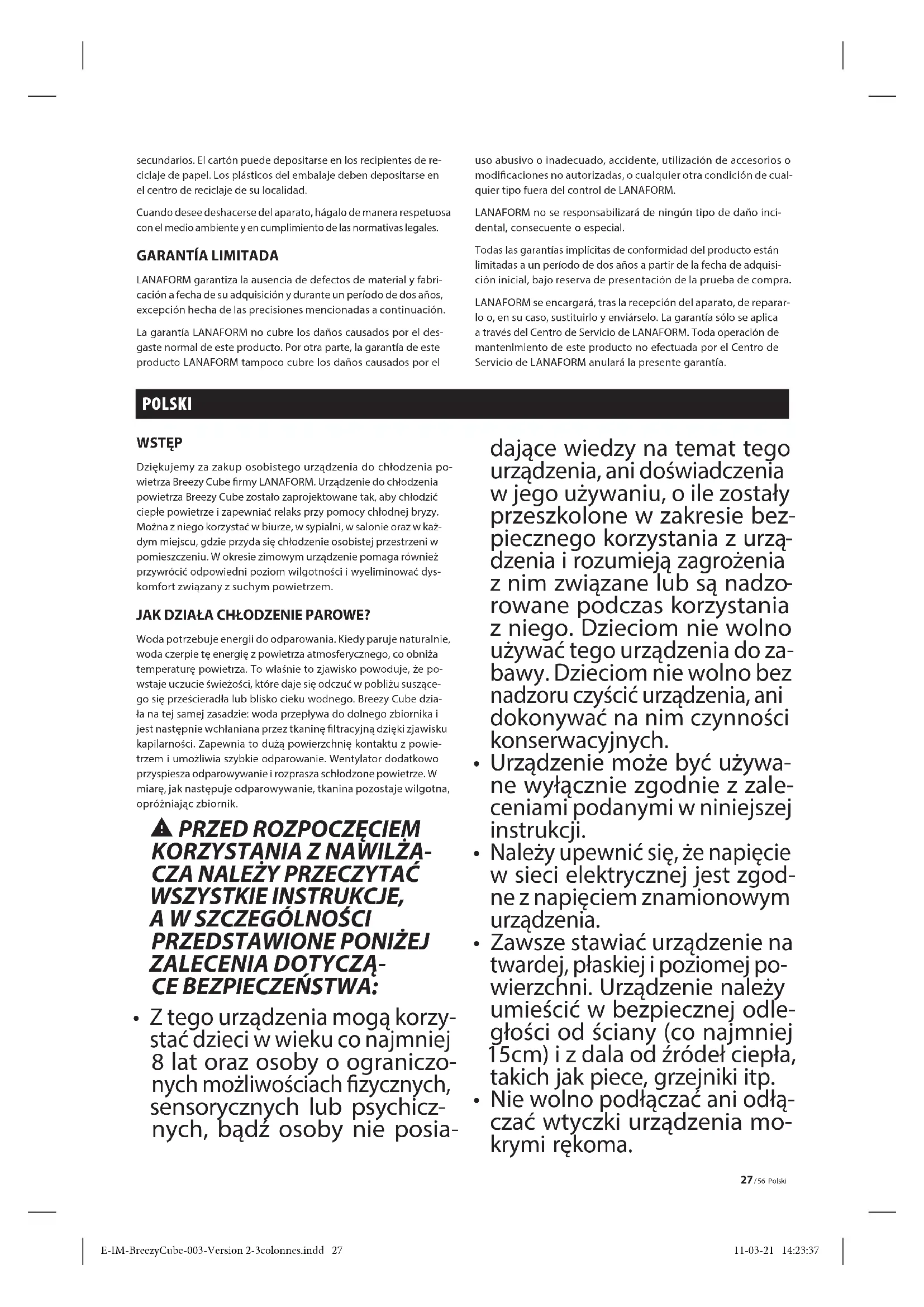 LANAFORM garantiza la ausencia de defectos de material y fabri- cación a fecha de su adquisición y durante un período de dos años, excepción hecha de las precisiones mencionadas a continuación. La garantía LANAFORM no cubre los daños causados por el des- gaste normal de este producto. Por otra parte, la garantía de este producto LANAFORM tampoco cubre los daños causados por el uso abusivo o inadecuado, accidente, utilización de accesorios o modicaciones no autorizadas, o cualquier otra condición de cual- quier tipo fuera del control de LANAFORM. LANAFORM no se responsabilizará de ningún tipo de daño inci- dental, consecuente o especial. Todas las garantías implícitas de conformidad del producto están limitadas a un período de dos años a partir de la fecha de adquisi- ción inicial, bajo reserva de presentación de la prueba de compra. LANAFORM se encargará, tras la recepción del aparato, de reparar- lo o, en su caso, sustituirlo y enviárselo. La garantía sólo se aplica a través del Centro de Servicio de LANAFORM. Toda operación de mantenimiento de este producto no efectuada por el Centro de Servicio de LANAFORM anulará la presente garantía. POLSKI WSTĘP Dziękujemy za zakup osobistego urządzenia do chłodzenia po- wietrza Breezy Cube rmy LANAFORM. Urządzenie do chłodzenia powietrza Breezy Cube zostało zaprojektowane tak, aby chłodzić ciepłe powietrze i zapewniać relaks przy pomocy chłodnej bryzy. Można z niego korzystać w biurze, w sypialni, w salonie oraz w każ- dym miejscu, gdzie przyda się chłodzenie osobistej przestrzeni w pomieszczeniu. W okresie zimowym urządzenie pomaga również przywrócić odpowiedni poziom wilgotności i wyeliminować dys- komfort związany z suchym powietrzem. JAK DZIAŁA CHŁODZENIE PAROWE? Woda potrzebuje energii do odparowania. Kiedy paruje naturalnie, woda czerpie tę energię z powietrza atmosferycznego, co obniża temperaturę powietrza. To właśnie to zjawisko powoduje, że po- wstaje uczucie świeżości, które daje się odczuć w pobliżu suszące- go się prześcieradła lub blisko cieku wodnego. Breezy Cube dzia- ła na tej samej zasadzie: woda przepływa do dolnego zbiornika i jest następnie wchłaniana przez tkaninę ltracyjną dzięki zjawisku kapilarności. Zapewnia to dużą powierzchnię kontaktu z powie- trzem i umożliwia szybkie odparowanie. Wentylator dodatkowo przyspiesza odparowywanie i rozprasza schłodzone powietrze. W miarę, jak następuje odparowywanie, tkanina pozostaje wilgotna, opróżniając zbiornik.
