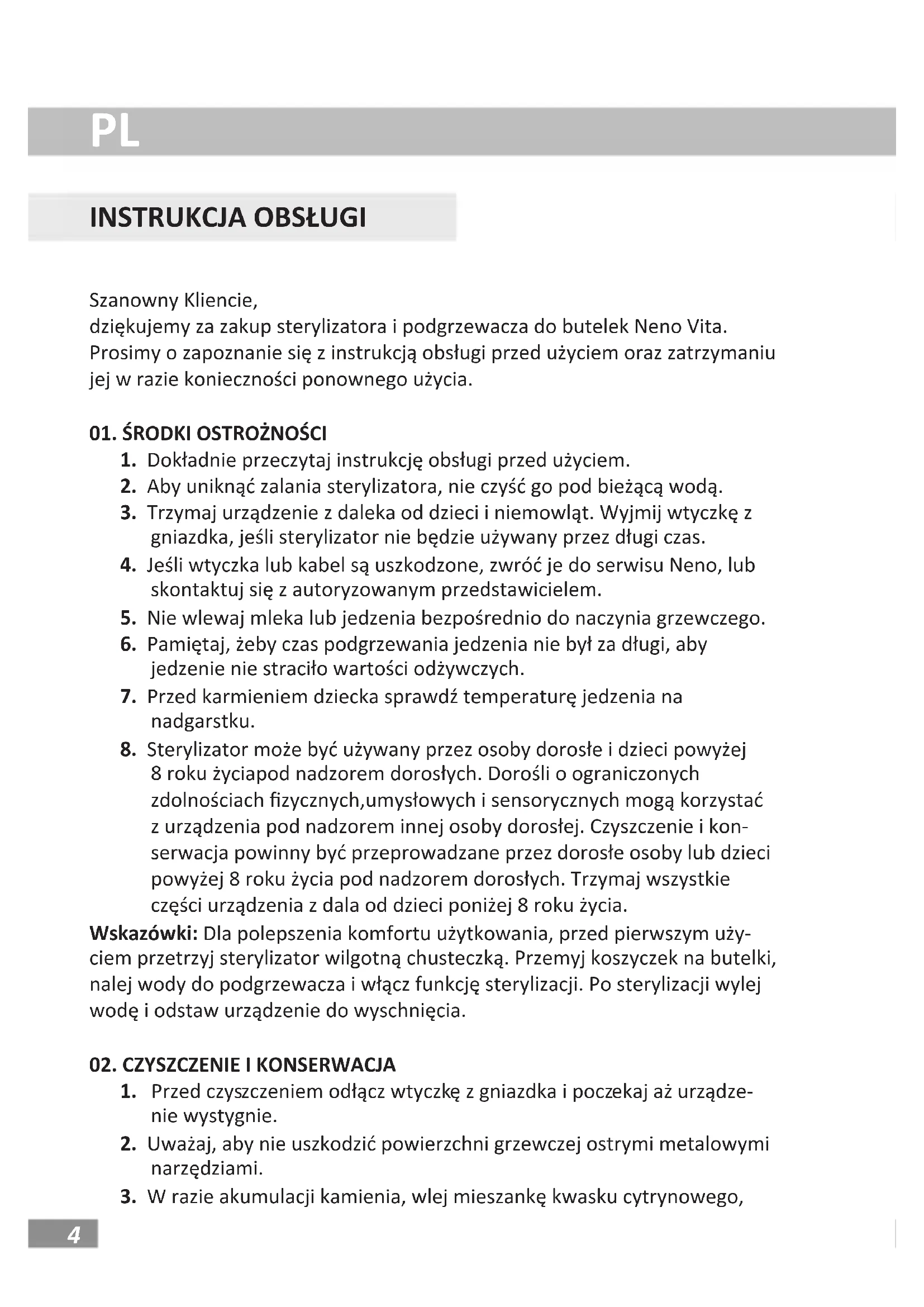 Szanowny Kliencie, dziękujemy za zakup sterylizatora i podgrzewacza do butelek Neno Vita. Prosimy o zapoznanie się z instrukcją obsługi przed użyciem oraz zatrzymaniu jej w razie konieczności ponownego użycia.