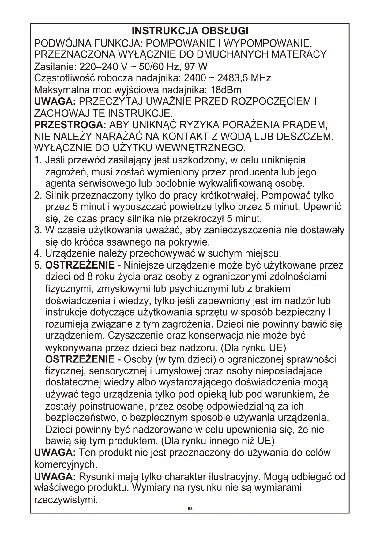dzieci od 8 roku życia oraz osoby z ograniczonymi zdolnościami fizycznymi, zmysłowymi lub psychicznymi lub z brakiem doświadczenia i wiedzy, tylko jeśli zapewniony jest im nadzór lub instrukcje dotyczące użytkowania sprzętu w sposób bezpieczny I rozumieją związane z tym zagrożenia. Dzieci nie powinny bawić się urządzeniem. Czyszczenie oraz konserwacja nie może być wykonywana przez dzieci bez nadzoru. (Dla rynku UE) OSTRZEŻENIE - Osoby (w tym dzieci) o ograniczonej sprawności fizycznej, sensorycznej i umysłowej oraz osoby nieposiadające dostatecznej wiedzy albo wystarczającego doświadczenia mogą używać tego urządzenia tylko pod opieką lub pod warunkiem, że zostały poinstruowane, przez osobę odpowiedzialną za ich bezpieczeństwo, o bezpiecznym sposobie używania urządzenia. Dzieci powinny być nadzorowane w celu upewnienia się, że nie bawią się tym produktem. (Dla rynku innego niż UE) UWAGA: Ten produkt nie jest przeznaczony do używania do celów komercyjnych. UWAGA: Rysunki mają tylko charakter ilustracyjny. Mogą odbiegać od właściwego produktu. Wymiary na rysunku nie są wymiarami rzeczywistymi.64 Instrukcja obsługi pompy: CZYSZCZENIE I PRZECHOWYWANIE: