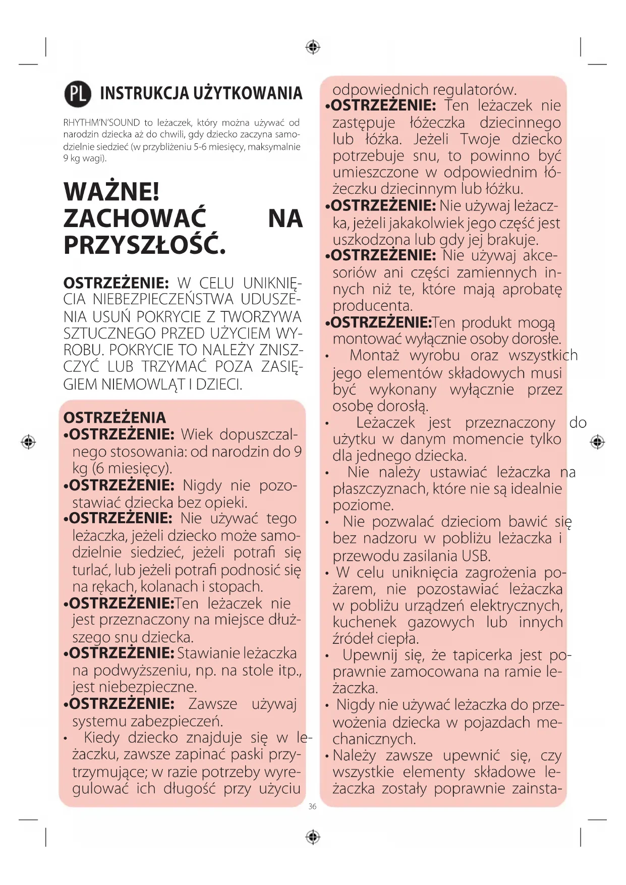 RHYTHM’N’SOUND to leżaczek, który można używać od narodzin dziecka aż do chwili, gdy dziecko zaczyna samo- dzielnie siedzieć (w przybliżeniu 5-6 miesięcy, maksymalnie 9 kg wagi). WAŻNE! ZACHOWAĆ NA PRZYSZŁOŚĆ.
