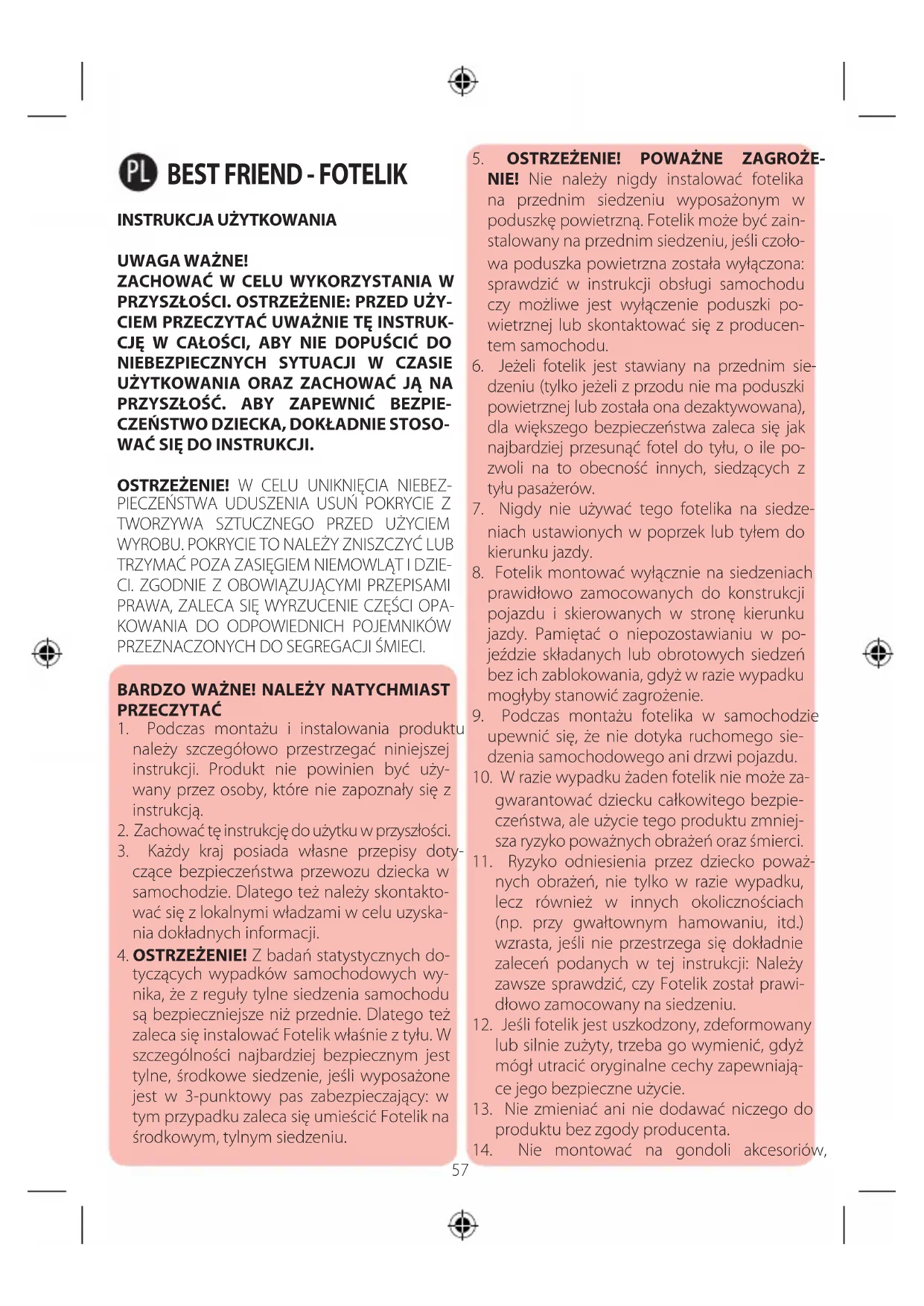 nim siedzeniu wyposażonym w poduszkę powietrzną, chyba że poduszka została wyłączona: spytać producenta lub spraw- dzić w instrukcji obsługi samochodu, czy poduszkę powietrzną można wyłączyć. OSTRZEŻENIE! W przypadku zastosowania w pojazdach wyposażonych w tylne pasy bezpieczeństwa ze zintegrowaną poduszką powietrzną (nadmuchiwane pasy bezpieczeń- stwa), wzajemne oddziaływanie na siebie pom- powanej części pasa pojazdu i tego systemu przytrzymującego dzieci może spowodować poważne obrażenia lub śmierć. Nie instalować tego systemu podtrzymującego dla dzieci przy użyciu nadmuchiwanego pasa bezpieczeń- stwa. Jeżeli fotelik samochodowy BEST FRIEND jest wyposażony w miniaturowy reduktor: OSTRZEŻENIE! Aby zagwarantować najwyż- sze bezpieczeństwo dziecka, nigdy nie używać miniaturowego reduktora jeżeli dziecko waży ponad 6 kg.