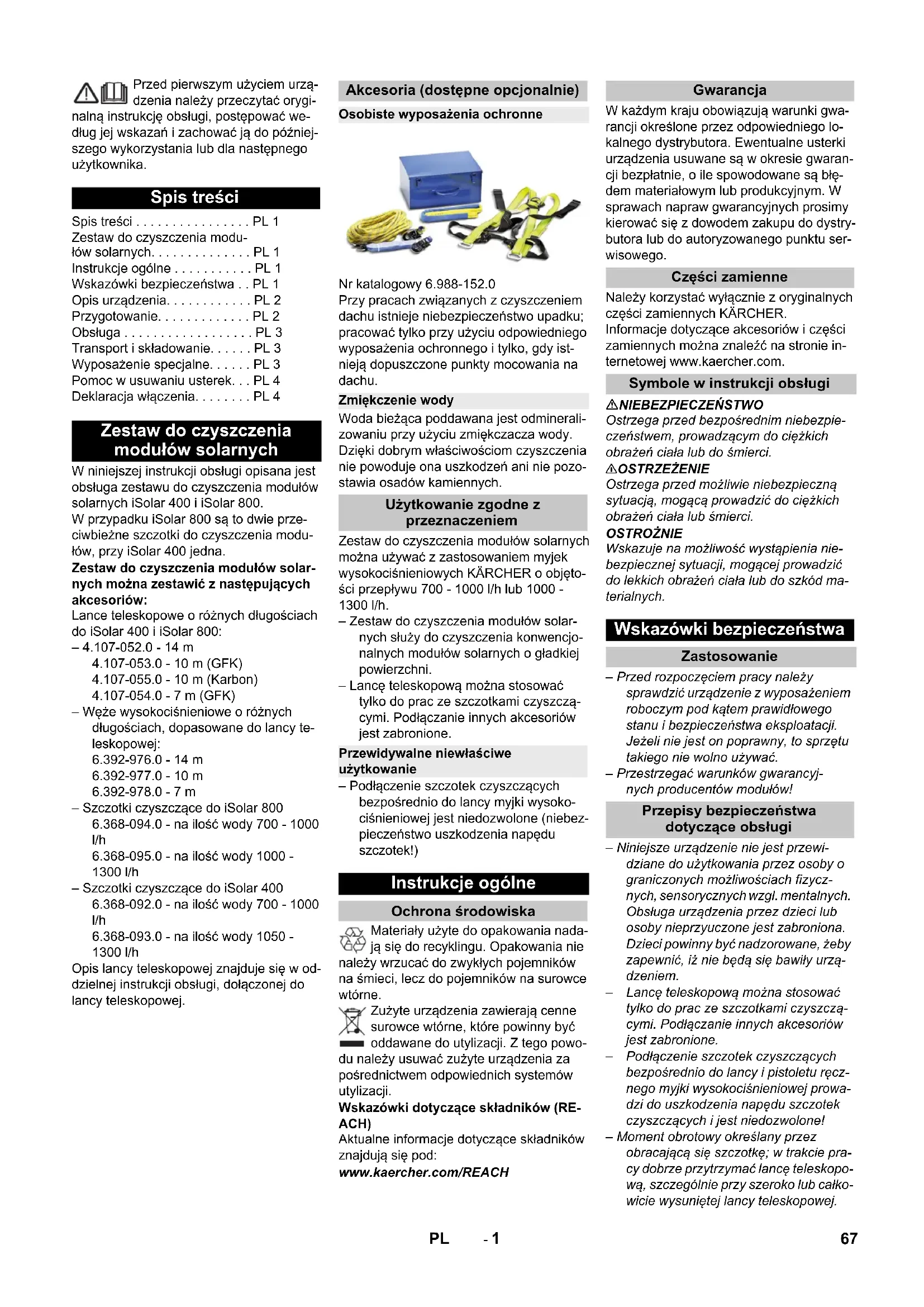 Podłączenie szczotek czyszczących bezpośrednio do lancy i pistoletu ręcz- nego myjki wysokociśnieniowej prowa- dzi do uszkodzenia napędu szczotek czyszczących i jest niedozwolone! – Moment obrotowy określany przez obracającą się szczotkę; w trakcie pra- cy dobrze przytrzymać lancę teleskopo- wą, szczególnie przy szeroko lub całko- wicie wysuniętej lancy teleskopowej. Spis treści Spis treści . . . . . . . . . . . . . . . . PL 1 Zestaw do czyszczenia modu- łów solarnych. . . . . . . . . . . . . . PL 1 Instrukcje ogólne . . . . . . . . . . . PL 1 Wskazówki bezpieczeństwa . . PL 1 Opis urządzenia. . . . . . . . . . . . PL 2 Przygotowanie. . . . . . . . . . . . . PL 2 Obsługa . . . . . . . . . . . . . . . . . . PL 3 Transport i składowanie. . . . . . PL 3 Wyposażenie specjalne. . . . . . PL 3 Pomoc w usuwaniu usterek. . . PL 4 Deklaracja włączenia. . . . . . . . PL 4 Zestaw do czyszczenia modułów solarnych Akcesoria (dostępne opcjonalnie) Osobiste wyposażenia ochronne Zmiękczenie wody Użytkowanie zgodne z przeznaczeniem Przewidywalne niewłaściwe użytkowanie Instrukcje ogólne Ochrona środowiska Gwarancja Części zamienne Symbole w instrukcji obsługi Wskazówki bezpieczeństwa Zastosowanie Przepisy bezpieczeństwa dotyczące obsługi 67PL- 2 – W trakcie prac związanych z czyszcze- niem zapewnić bezpieczne ustawienie. – Przed czyszczeniem sprawdzić moduły pod kątem uszkodzenia (rysy, zadrapa- nia, nieszczelność itd.). Uszkodzonych modułów nie można czyścić. – Po zakończeniu czyszczenia wyłączyć myjkę wysokociśnieniową, zamknąć dopływ wody do urządzenia, pozbawić system ciśnienia przez otwarcie kurka odcinającego, a następnie odłączyć wąż wysokociśnieniowy od lancy tele- skopowej. – Maksymalna temperatura wody to 40 °C (przestrzegać wskazówek eks- ploatacji wysokociśnieniowego urzą- dzenia czyszczącego). – Przestrzegać wskazówek bezpieczeń- stwa wysokociśnieniowego urządzenia czyszczącego. – Prace związane z czyszczeniem prze- prowadzają co najmniej 2 osoby. Wykonywanie czyszczenia z jednej drabiny jest zabronione. – Urządzenie może być używane tylko przez osoby, które zostały przeszkolo- ne w zakresie obsługi i zostały wyraźnie do tego wyznaczone. – Pod adresem www.kaercher.com ist- nieje wideo iSolar z ważnymi infor- macjami dotyczącymi pracy przy użyciu zestawu do czyszczenia mo- dułów solarnych. Koniecznie obej- rzeć! NIEBEZPIECZEŃSTWO Zagrożenie życia! – Przewody i elementy urządzeń fotowol- taicznych są w przypadku dostępu światła zawsze pod napięciem elek- trycznym. Dotknięcie części przewo- dzących prąd jest zabronione i może prowadzić do porażenia prądem. Nie przeprowadzać czyszczenia w po- bliżu przewodów wysokiego napięcia ani innych urządzeń elektrycznych. Szczególną uwagę należy zwrócić na obsługę lancy teleskopowej w pobliż