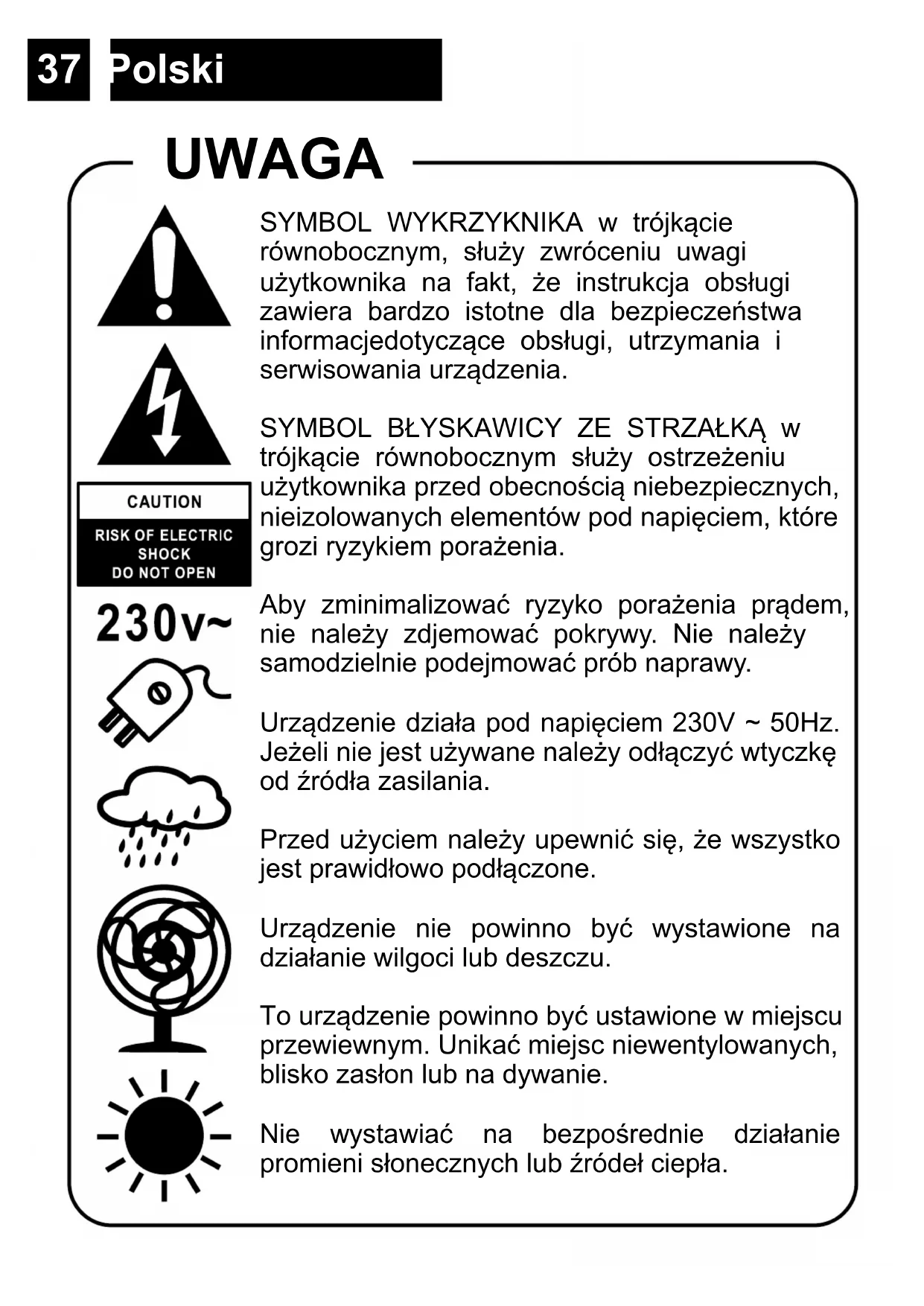 Doplňujúce informácie Pred prenášaním prístroja zaistite ramienko a na hrot prenosky umiestnite kryt – oba tieto diely tak budú chránené pred poškodením. V žiadnom prípade neobmedzujte rýchlosť otáčania taniera príp. nezastavujte tanier rukou. TECHNICKÉ ÚDAJE AC: 230V - 50Hz FM: 87,5 - 108 MHz Nf výkon: 2x 1.5W RMS Zmeny designu a technických údajov vyhradené bez Tento symbol na výrobku, jeho príslušenstve alebo obale označuje, že pri naskoršej likvidácii výrobku (z akýchkoľvek dôvodov) nesmie byť s výrobkom zachádzané ako s domácim odpadom. Výrobok zlikvidujte jeho odovzdaním na zberné miesto pre likvidáciu použitých elektrických a elektronických zariadení šetrnú k životnému prostrediu. Zaistením ich správnej likvidácie zabránite vzniku potenciálnych rizík pre životné prostredie a ľudské zdravie, ktorá by mohla vzniknúť nesprávnym zachádzaním s odpadmi. Okrem toho recyklácia odpadových materiálov napomáha udržaniu prírodných zdrojov surovín pre budúce generácie. Podrobné informácie k likvidácii tohto výrobku šetrné k životnému prostrediu získate u pracovníka ochrany životného prostredia miestneho (mestského alebo obvodného) úradu alebo v predajni, v ktorej ste výrobok zakúpili. POKYNY PRE SPRÁVNU LIKVIDÁCIU VÝROBKU (likvidácii použitých elektrických a elektronických zariadení)37 Polski UWAGA SYMBOL WYKRZYKNIKA w trójkącie równobocznym, służy zwróceniu uwagi użytkownika na fakt, że instrukcja obsługi zawiera bardzo istotne dla bezpieczeństwa informacjedotyczące obsługi, utrzymania i serwisowania urządzenia. SYMBOL BŁYSKAWICY ZE STRZAŁKĄ w trójkącie równobocznym służy ostrzeżeniu użytkownika przed obecnością niebezpiecznych, nieizolowanych elementów pod napięciem, które grozi ryzykiem porażenia. Aby zminimalizować ryzyko porażenia prądem, nie należy zdjemować pokrywy. Nie należy samodzielnie podejmować prób naprawy. Urządzenie działa pod napięciem 230V ~ 50Hz. Jeżeli nie jest używane należy odłączyć wtyczkę od źródła zasilania. Przed użyciem należy upewnić się, że wszystko jest prawidłowo podłączone. Urządzenie nie powinno być wystawione na działanie wilgoci lub deszczu. To urządzenie powinno być ustawione w miejscu przewiewnym. Unikać miejsc niewentylowanych, blisko zasłon lub na dywanie. Nie wystawiać na bezpośrednie działanie promieni słonecznych lub źródeł ciepła.38 Polski