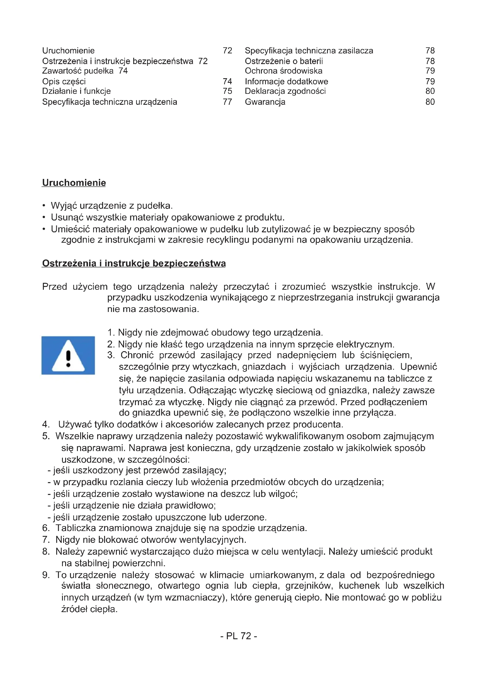 światła słonecznego, otwartego ognia lub ciepła, grzejników, kuchenek lub wszelkich innych urządzeń (w tym wzmacniaczy), które generują ciepło. Nie montować go w pobliżu źródeł ciepła. Uruchomienie 72 Ostrzeżenia i instrukcje bezpieczeństwa 72 Zawartość pudełka 74 Opis części 74 Działanie i funkcje 75 Specykacja techniczna urządzenia 77 Specykacja techniczna zasilacza 78 Ostrzeżenie o baterii 78 Ochrona środowiska 79 Informacje dodatkowe 79 Deklaracja zgodności 80 Gwarancja 80- PL 73 -