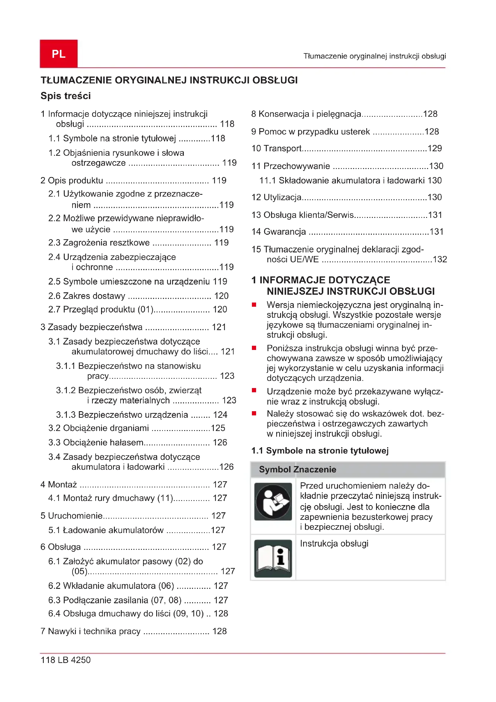 Symbol Znaczenie Zachować szczególną ostrożność podczas obsługi urządzenia! Przed uruchomieniem przeczytać instrukcję eksploatacji! Niebezpieczeństwo uderzenia przez odrzucone przedmioty.PL 120 LB 4250 Opis produktu Symbol Znaczenie Nie dopuszczać osób trzecich do niebezpiecznego obszaru! Nie wkładać rąk do wentylatora! Zagrożenie ze strony obracających się podzespołów. Przed przystąpieniem do konserwa- cji przeczytać instrukcję eksploata- cji. Nosić środki ochrony oczu isłuchu! Chronić urządzenie przed desz- czem iwilgocią!