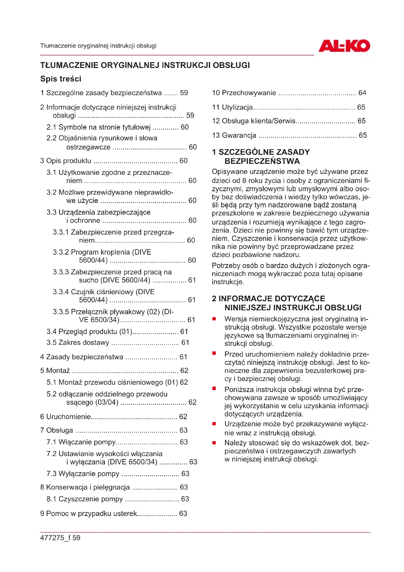 Pobierz instrukcję dla swojego Pompa w formacie PDF za darmo! Znajdź swoją instrukcję Dive 63004 - AL-KO i weź swoje urządzenie elektroniczne z powrotem w ręce. Na tej stronie opublikowane są wszystkie dokumenty niezbędne do korzystania z urządzenia. Dive 63004 marki AL-KO.