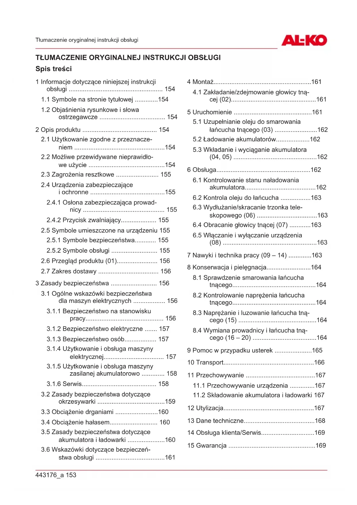 Wszelkie pytania dotyczące gwarancji, naprawy lub części zamiennych należy kierować do naj- bliższego punktu serwisowego AL-KO. Można go znaleźć w następującej witrynie internetowej: www.al-ko.com/service-contacts 15 GWARANCJA Ewentualne wady materiałowe lub produkcyjne wurządzeniu usuwamy przed upływem ustawowego okresu przedawnienia roszczeń ztytułu rękojmi za wady fizyczne, dokonując wedle naszego uznania naprawy lub wymiany produktu. Okres przedawnienia ustalany jest zgodnie zprawem obowiązującym wkraju, wktórym produkt został zakupiony. Gwarancja obowiązuje tylko wprzypadku: