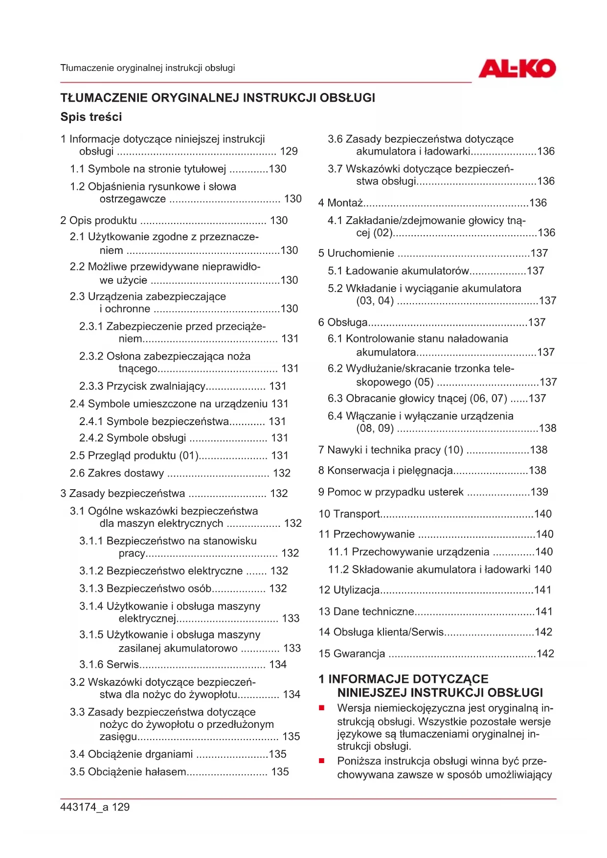 Wszelkie pytania dotyczące gwarancji, naprawy lub części zamiennych należy kierować do naj- bliższego punktu serwisowego AL-KO. Można go znaleźć w następującej witrynie internetowej: www.al-ko.com/service-contacts 15 GWARANCJA Ewentualne wady materiałowe lub produkcyjne wurządzeniu usuwamy przed upływem ustawowego okresu przedawnienia roszczeń ztytułu rękojmi za wady fizyczne, dokonując wedle naszego uznania naprawy lub wymiany produktu. Okres przedawnienia ustalany jest zgodnie zprawem obowiązującym wkraju, wktórym produkt został zakupiony. Gwarancja obowiązuje tylko wprzypadku: