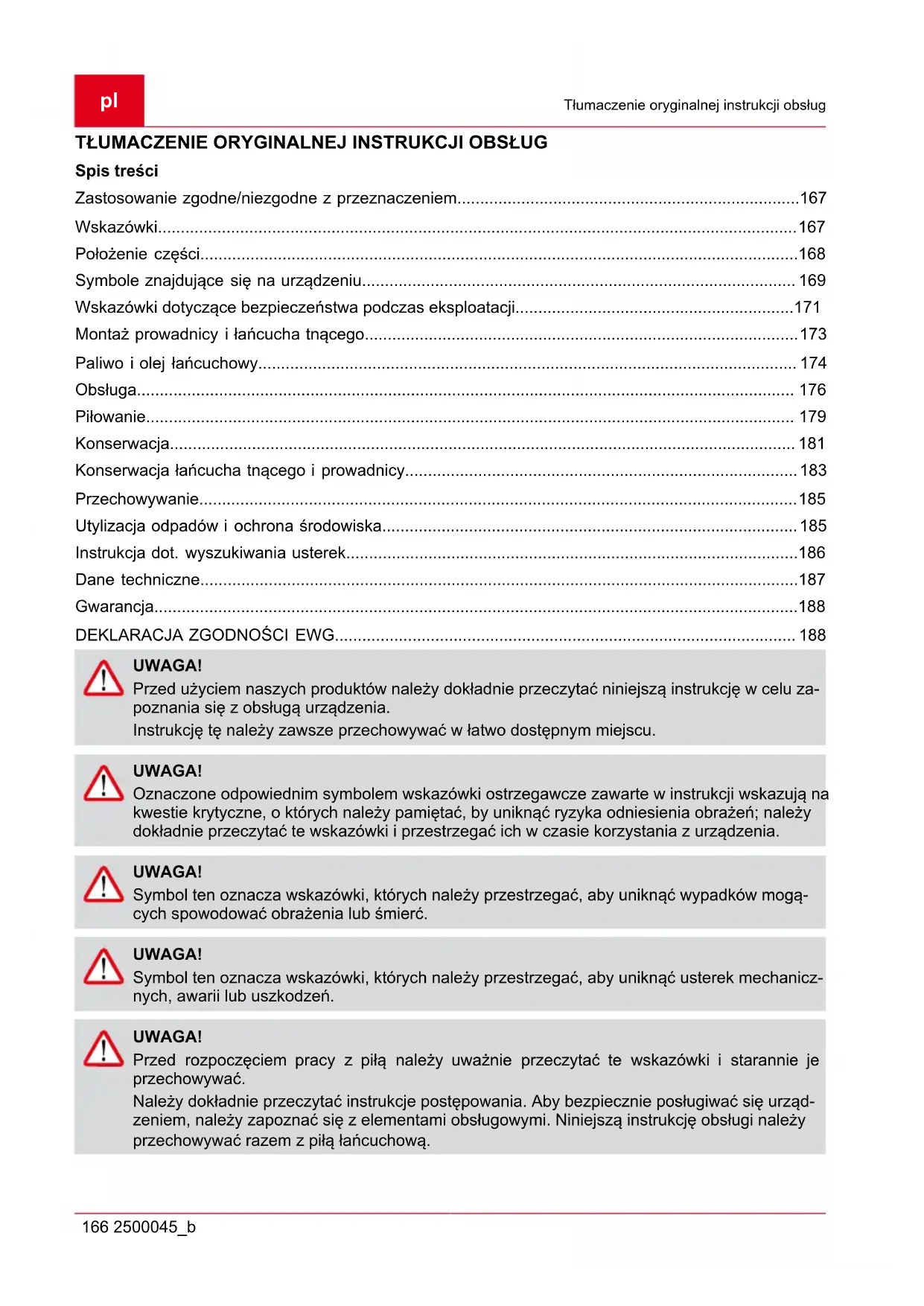 - DEKLARACJA ZGODNOŚCI EWG UWAGA! Przed użyciem naszych produktów należy dokładnie przeczytać niniejszą instrukcję w celu za- poznania się z obsługą urządzenia. Instrukcję tę należy zawsze przechowywać w łatwo dostępnym miejscu. UWAGA! Oznaczone odpowiednim symbolem wskazówki ostrzegawcze zawarte w instrukcji wskazują na kwestie krytyczne, o których należy pamiętać, by uniknąć ryzyka odniesienia obrażeń; należy dokładnie przeczytać te wskazówki i przestrzegać ich w czasie korzystania z urządzenia. UWAGA! Symbol ten oznacza wskazówki, których należy przestrzegać, aby uniknąć wypadków mogą- cych spowodować obrażenia lub śmierć. UWAGA! Symbol ten oznacza wskazówki, których należy przestrzegać, aby uniknąć usterek mechanicz- nych, awarii lub uszkodzeń. UWAGA! Przed rozpoczęciem pracy z piłą należy uważnie przeczytać te wskazówki i starannie je przechowywać. Należy dokładnie przeczytać instrukcje postępowania. Aby bezpiecznie posługiwać się urząd- zeniem, należy zapoznać się z elementami obsługowymi. Niniejszą instrukcję obsługi należy przechowywać razem z piłą łańcuchową.Tłumaczenie oryginalnej instrukcji obsług 2500045_b 167 UWAGA! Niebezpieczeństwo uszkodzenia słuchu! W normalnych warunkach eksploatacji osoba obsługująca urządzenie może być narażona na poziom ciśnienia akustycznego o wartości 80 dB(A) lub więcej. Piłę łańcuchową należy chwytać prawą dłonią za tylny uchwyt i lewą dłonią za przedni uchwyt. UWAGA! Ochrona przed hałasem! Podczas pracy z urządzeniem należy przestrzegać lokalnych przepisów. p. 188