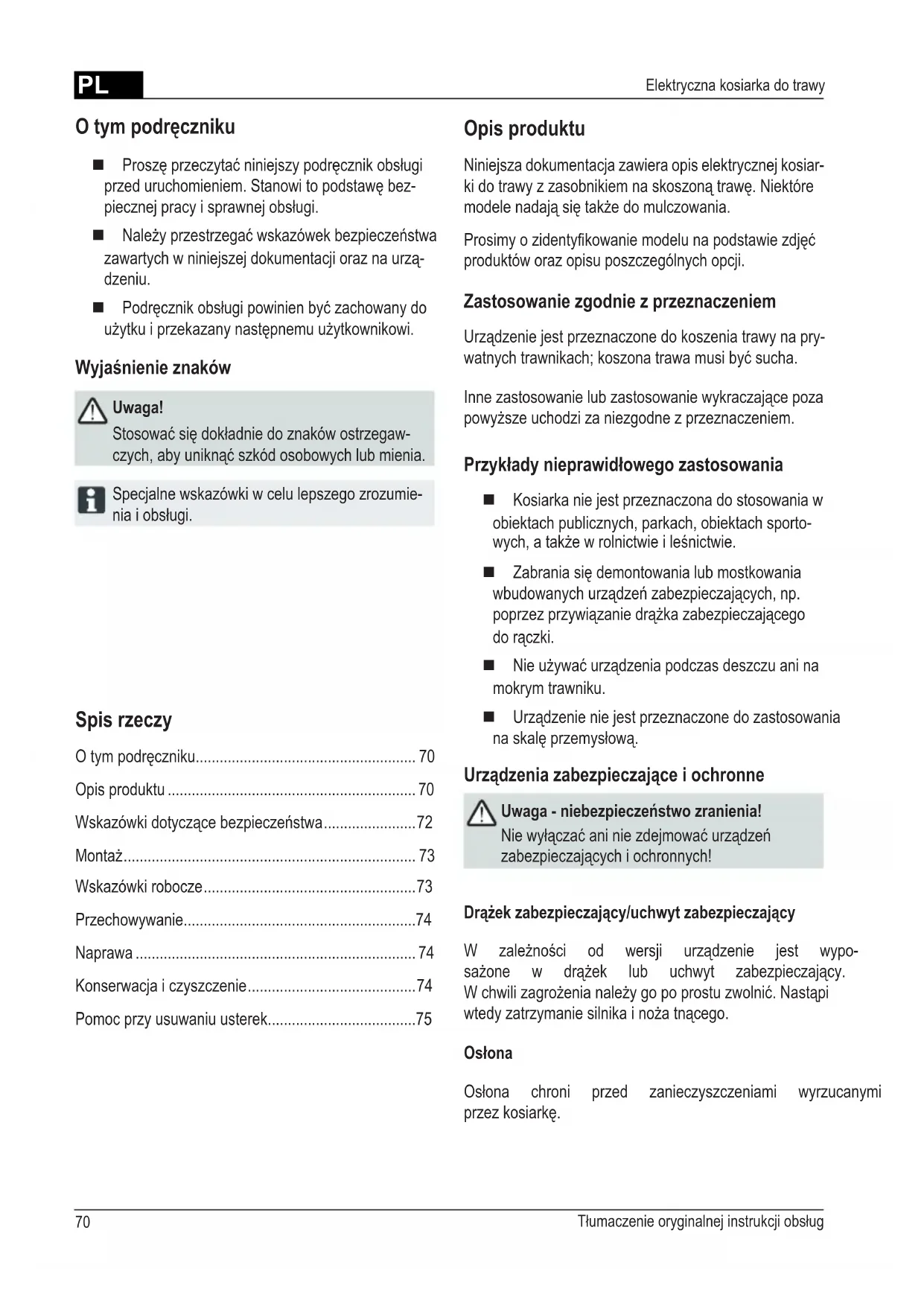 - Pomoc przy usuwaniu usterek O tym podręczniku Proszęprzeczytaćniniejszypodręcznikobsługi przeduruchomieniem.Stanowitopodstawębez- piecznejpracyisprawnejobsługi. Należyprzestrzegaćwskazówekbezpieczeństwa zawartychwniniejszejdokumentacjioraznaurzą- dzeniu. Podręcznikobsługipowinienbyćzachowanydo użytkuiprzekazanynastępnemuużytkownikowi. Wyjaśnienie znaków Uwaga! Stosowaćsiędokładniedoznakówostrzegaw- czych,abyuniknąćszkódosobowychlubmienia. Specjalne wskazówki w celu lepszego zrozumie- niaiobsługi. Opis produktu Niniejsza dokumentacja zawiera opis elektrycznej kosiar- kidotrawyzzasobnikiemnaskoszonątrawę.Niektóre modelenadająsiętakżedomulczowania. Prosimyozidentykowaniemodelunapodstawiezdjęć produktów oraz opisu poszczególnych opcji. Zastosowanie zgodnie z przeznaczeniem Urządzeniejestprzeznaczonedokoszeniatrawynapry- watnychtrawnikach;koszonatrawamusibyćsucha. Innezastosowanielubzastosowaniewykraczającepoza powyższeuchodzizaniezgodnezprzeznaczeniem. Przykłady nieprawidłowego zastosowania Kosiarka nie jest przeznaczona do stosowania w obiektach publicznych, parkach, obiektach sporto- wych,atakżewrolnictwieileśnictwie. Zabraniasiędemontowanialubmostkowania wbudowanychurządzeńzabezpieczających,np. poprzezprzywiązaniedrążkazabezpieczającego dorączki. Nieużywaćurządzeniapodczasdeszczuanina mokrym trawniku. Urządzenieniejestprzeznaczonedozastosowania naskalęprzemysłową. Urządzenia zabezpieczające i ochronne Uwaga - niebezpieczeństwo zranienia! Niewyłączaćaniniezdejmowaćurządzeń zabezpieczającychiochronnych! Drążek zabezpieczający/uchwyt zabezpieczający W zależności od wersji urządzenie jest wypo- sażone w drążek lub uchwyt zabezpieczający. Wchwilizagrożenianależygopoprostuzwolnić.Nastąpi wtedyzatrzymaniesilnikainożatnącego. Osłona Osłona chroni przed zanieczyszczeniami wyrzucanymi przezkosiarkę.PL p. 75