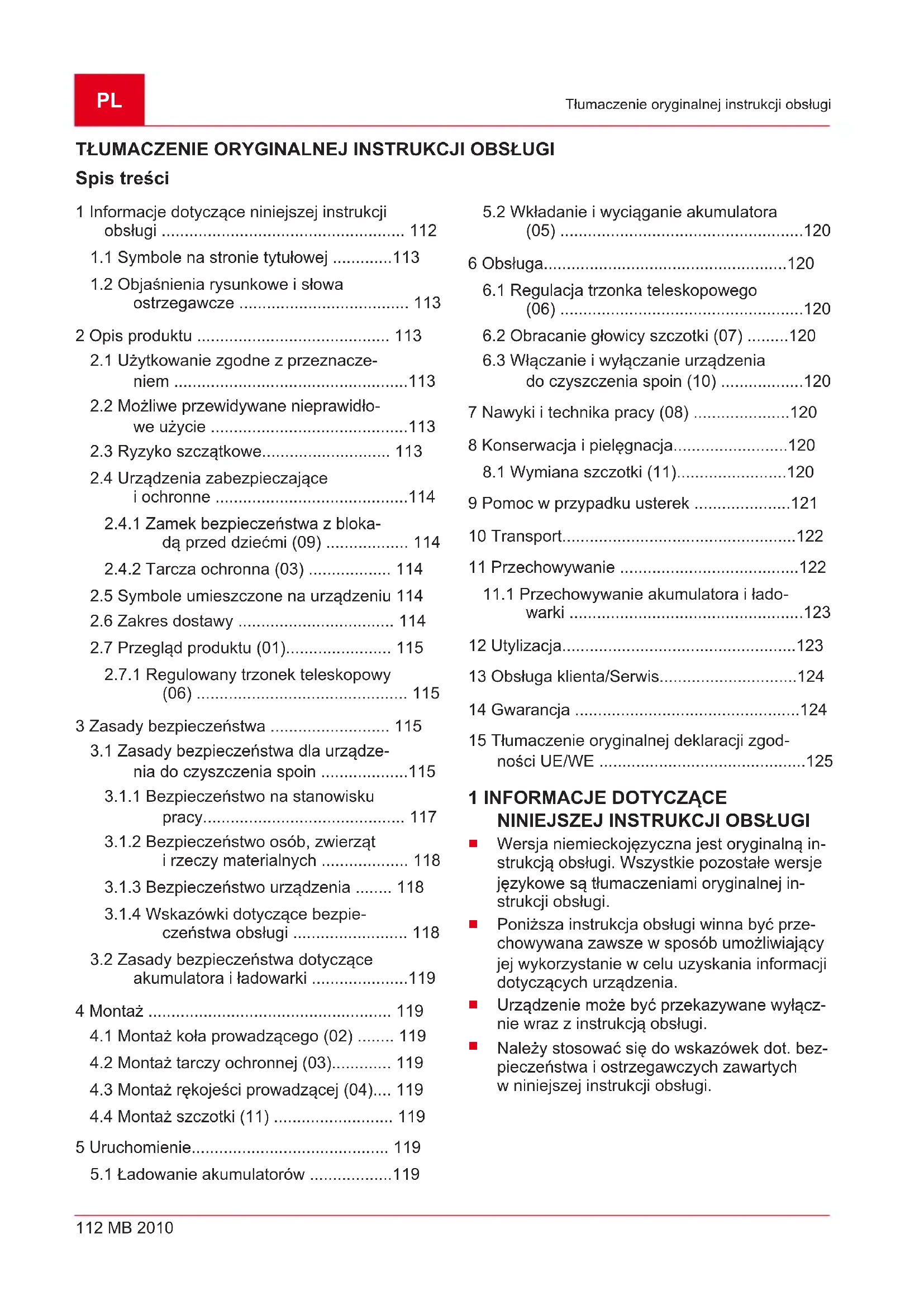 Okres gwarancji rozpoczyna się od momentu nabycia przez pierwszego użytkownika końcowego. De- cydujące znaczenie ma tutaj data dokumentu zakupu. Należy zwrócić się do dystrybutora lub najbliż- szego autoryzowanego punktu serwisowego, przedkładając niniejszą deklarację gwarancyjną oraz do- wód zakupu. Niniejsza deklaracja nie narusza ustawowych roszczeń nabywcy wstosunku do sprze- dawcy ztytułu wad.442608_a 125 Tłumaczenie oryginalnej deklaracji zgodności UE/WE 15 TŁUMACZENIE ORYGINALNEJ DEKLARACJI ZGODNOŚCI UE/WE Niniejszym oświadczamy na własną odpowiedzialność, że produkt we wprowadzonej przez nas na ry- nek wersji spełnia wymagania zharmonizowanych dyrektyw UE, standardów bezpieczeństwa UE oraz standardów obowiązujących dla danego produktu. Produkt Akumulatorowe urządzenie do czyszczenia spoin Numer seryjny G4990012 Producent AL-KO Geräte GmbH Ichenhauser Str. 14 D-89359 Kötz Osoba sporządzająca dokumentację Andreas Hedrich Ichenhauser Str. 14 D-89359 Kötz Typ MB 2010 Dyrektywy UE 2006/42/EC 2014/30/EU 2011/65/EU Normy zharmonizowane EN 60745-1:2009+A11:2010 EN 786:1996+A2:2009 EN 55014-1:2017 EN 55014-2:2015 Kötz, 2018-11-15 Dr. Wolfgang Hergeth Managing DirectorCZ 126 MB 2010 Překlad originálního návodu kpoužití PŘEKLAD ORIGINÁLNÍHO NÁVODU KPOUŽITÍ Obsah 1 K tomuto návodu k použití ....................... 126