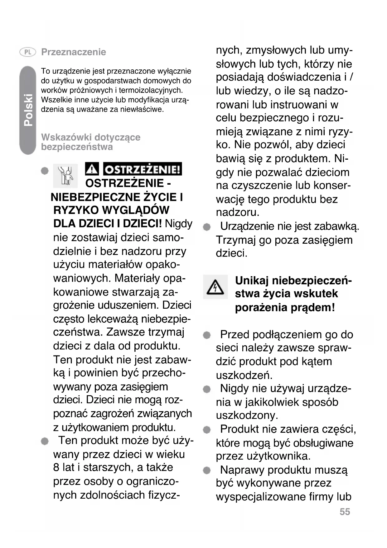 DLA DZIECI I DZIECI! Nigdy nie zostawiaj dzieci samo- dzielnie i bez nadzoru przy użyciu materiałów opako- waniowych. Materiały opa- kowaniowe stwarzają za- grożenie uduszeniem. Dzieci często lekceważą niebezpie- czeństwa. Zawsze trzymaj dzieci z dala od produktu. Ten produkt nie jest zabaw- ką i powinien być przecho- wywany poza zasięgiem dzieci. Dzieci nie mogą roz- poznać zagrożeń związanych z użytkowaniem produktu. Ten produkt może być uży- wany przez dzieci w wieku 8 lat i starszych, a także przez osoby o ograniczo- nych zdolnościach zycz- nych, zmysłowych lub umy- słowych lub tych, którzy nie posiadają doświadczenia i / lub wiedzy, o ile są nadzo- rowani lub instruowani w celu bezpiecznego i rozu- mieją związane z nimi ryzy- ko. Nie pozwól, aby dzieci bawią się z produktem. Ni- gdy nie pozwalać dzieciom na czyszczenie lub konser- wację tego produktu bez nadzoru. Urządzenie nie jest zabawką. Trzymaj go poza zasięgiem dzieci. Unikaj niebezpieczeń- stwa życia wskutek porażenia prądem! Przed podłączeniem go do sieci należy zawsze spraw- dzić produkt pod kątem uszkodzeń. Nigdy nie używaj urządze- nia w jakikolwiek sposób uszkodzony. Produkt nie zawiera części, które mogą być obsługiwane przez użytkownika. Naprawy produktu muszą być wykonywane przez wyspecjalizowane rmy lub Polski56 obsługę klienta. Niewłaści- we naprawy mogą spowo- dować znaczne zagrożenia dla użytkownika. Utrudni to również gwarancję. Jeśli urządzenie nie jest używane, należy odłączyć wtyczkę sieciową. Nie używaj urządzenia, jeśli kabel lub wtyczka zostały uszkodzone. OSTRZEŻENIE -