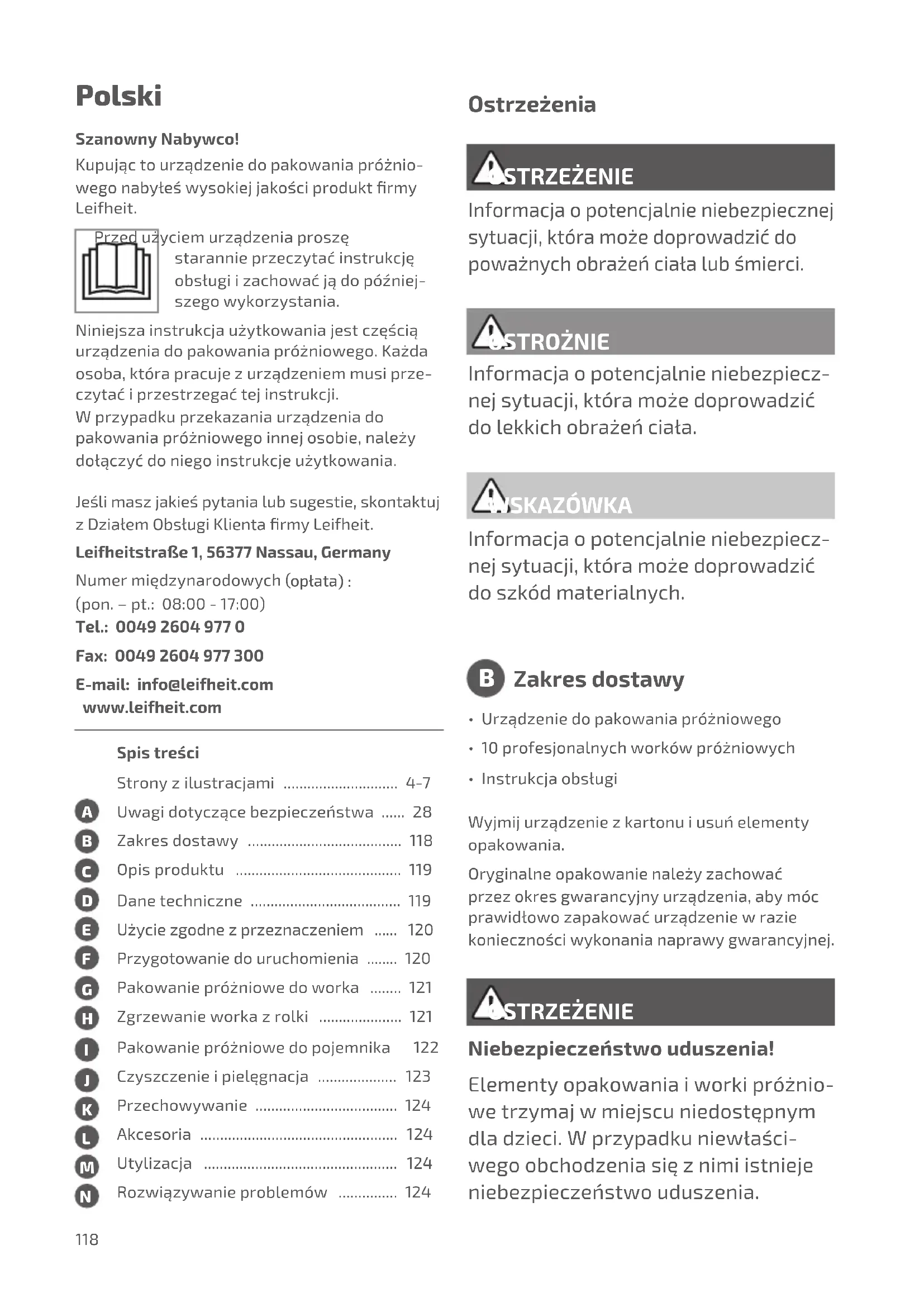- Säkerställ att behållarens kant är tillräckligt ren. Om alla ovannämnda situationer är utes- lutna, vänd dig till det angivna servicestället. SE118 Szanowny Nabywco! Kupując to urządzenie do pakowania próżnio- wego nabyłeś wysokiej jakości produkt rmy Leifheit. Przed użyciem urządzenia proszę starannie przeczytać instrukcję obsługi i zachować ją do później- szego wykorzystania. Niniejsza instrukcja użytkowania jest częścią urządzenia do pakowania próżniowego. Każda osoba, która pracuje z urządzeniem musi prze- czytać i przestrzegać tej instrukcji. W przypadku przekazania urządzenia do pakowania próżniowego innej osobie, należy dołączyć do niego instrukcje użytkowania. Spis treści Strony z ilustracjami ............................. 4-7 Uwagi dotyczące bezpieczeństwa ...... 28 Zakres dostawy ....................................... 118 Opis produktu .......................................... 119 Dane techniczne ...................................... 119 Użycie zgodne z przeznaczeniem ...... 120 Przygotowanie do uruchomienia ........ 120 Pakowanie próżniowe do worka ........ 121 Zgrzewanie worka z rolki ..................... 121 Pakowanie próżniowe do pojemnika 122 Czyszczenie i pielęgnacja .................... 123 Przechowywanie .................................... 124 Akcesoria .................................................. 124 Utylizacja ................................................. 124 Rozwiązywanie problemów ............... 124 Polski OSTRZEŻENIE OSTRZEŻENIE Ostrzeżenia Informacja o potencjalnie niebezpiecznej sytuacji, która może doprowadzić do poważnych obrażeń ciała lub śmierci. Niebezpieczeństwo uduszenia! Elementy opakowania i worki próżnio- we trzymaj w miejscu niedostępnym dla dzieci. W przypadku niewłaści- wego obchodzenia się z nimi istnieje niebezpieczeństwo uduszenia.