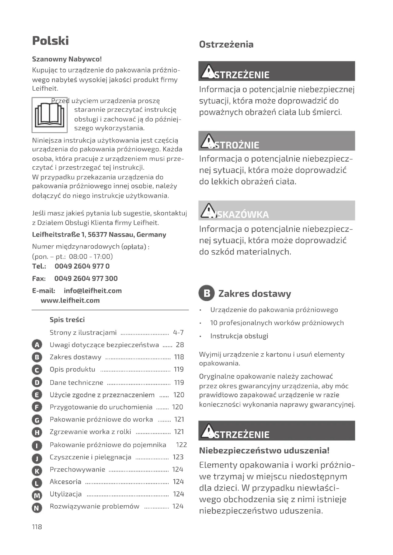 - Säkerställattbehållarenskantärtillräckligt ren.Omallaovannämndasituationerärutes- lutna,vänddigtilldetangivnaservicestället. SE118 SzanownyNabywco! Kupująctourządzeniedopakowaniapróżnio- wegonabyłeśwysokiejjakościproduktrmy Leifheit. Przedużyciemurządzeniaproszę starannieprzeczytaćinstrukcję obsługiizachowaćjądopóźniej- szegowykorzystania. Niniejszainstrukcjaużytkowaniajestczęścią urządzeniadopakowaniapróżniowego.Każda osoba,którapracujezurządzeniemmusiprze- czytaćiprzestrzegaćtejinstrukcji. Wprzypadkuprzekazaniaurządzeniado pakowaniapróżniowegoinnejosobie,należy dołączyćdoniegoinstrukcjeużytkowania. Spistreści Stronyzilustracjami ............................. 4-7 Uwagidotyczącebezpieczeństwa...... 28 Zakresdostawy ....................................... 118 Opisproduktu .......................................... 119 Danetechniczne ...................................... 119 Użyciezgodnezprzeznaczeniem ...... 120 Przygotowaniedouruchomienia ........ 120 Pakowaniepróżniowedoworka ........ 121 Zgrzewanieworkazrolki ..................... 121 Pakowaniepróżniowedopojemnika 122 Czyszczenieipielęgnacja .................... 123 Przechowywanie.................................... 124 Akcesoria .................................................. 124 Utylizacja ................................................. 124 Rozwiązywanieproblemów ............... 124 Polski OSTRZEŻENIE OSTRZEŻENIE Ostrzeżenia Informacjaopotencjalnieniebezpiecznej sytuacji,któramożedoprowadzićdo poważnychobrażeńciałalubśmierci. Niebezpieczeństwouduszenia! Elementyopakowaniaiworkipróżnio- wetrzymajwmiejscuniedostępnym dladzieci.Wprzypadkuniewłaści- wegoobchodzeniasięznimiistnieje niebezpieczeństwouduszenia.