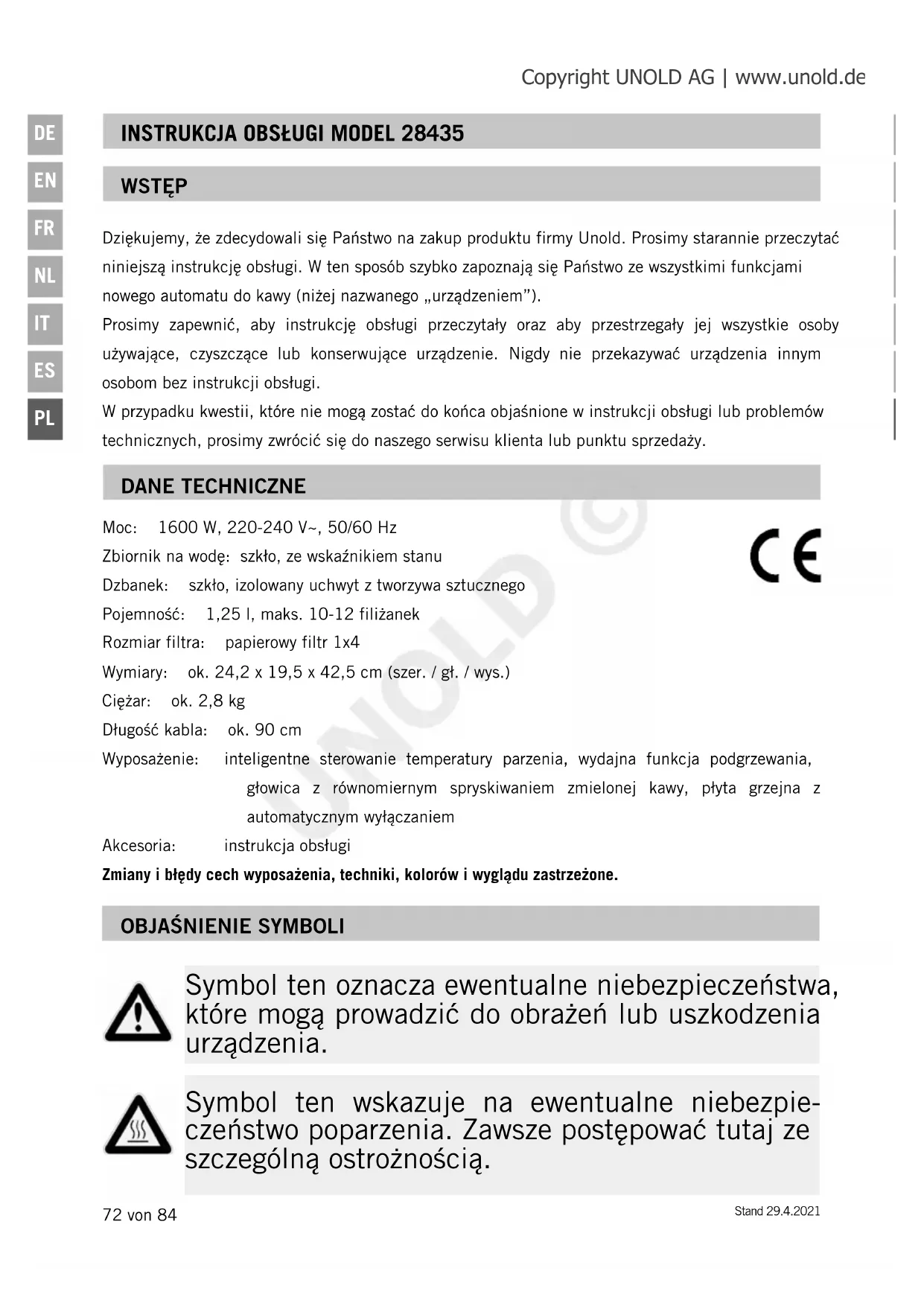 Symbol ten oznacza ewentualne niebezpieczeństwa, które mogą prowadzić do obrażeń lub uszkodzenia urządzenia. Symbol ten wskazuje na ewentualne niebezpie- czeństwo poparzenia. Zawsze postępować tutaj ze szczególną ostrożnością. Copyright UNOLD AG | www.unold.de UNOLD ©Stand 29.4.2021 73 von 84