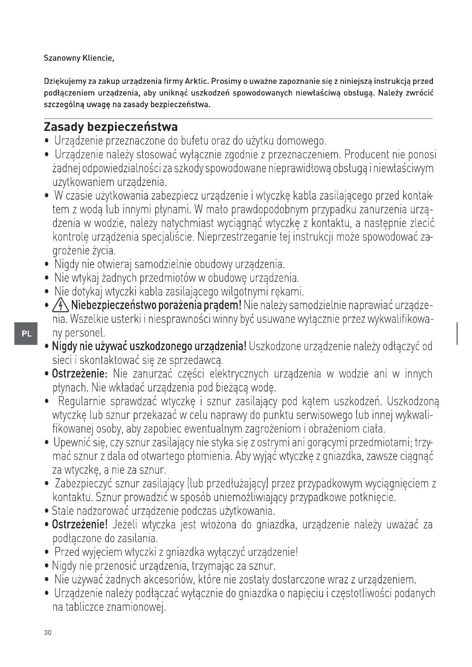 Szanowny Kliencie, Dziękujemy za zakup urządzenia firmy Arktic. Prosimy o uważne zapoznanie się z niniejszą instrukcją przed podłączeniem urządzenia, aby uniknąć uszkodzeń spowodowanych niewłaściwą obsługą. Należy zwrócić szczególną uwagę na zasady bezpieczeństwa. Zasady bezpieczeństwa