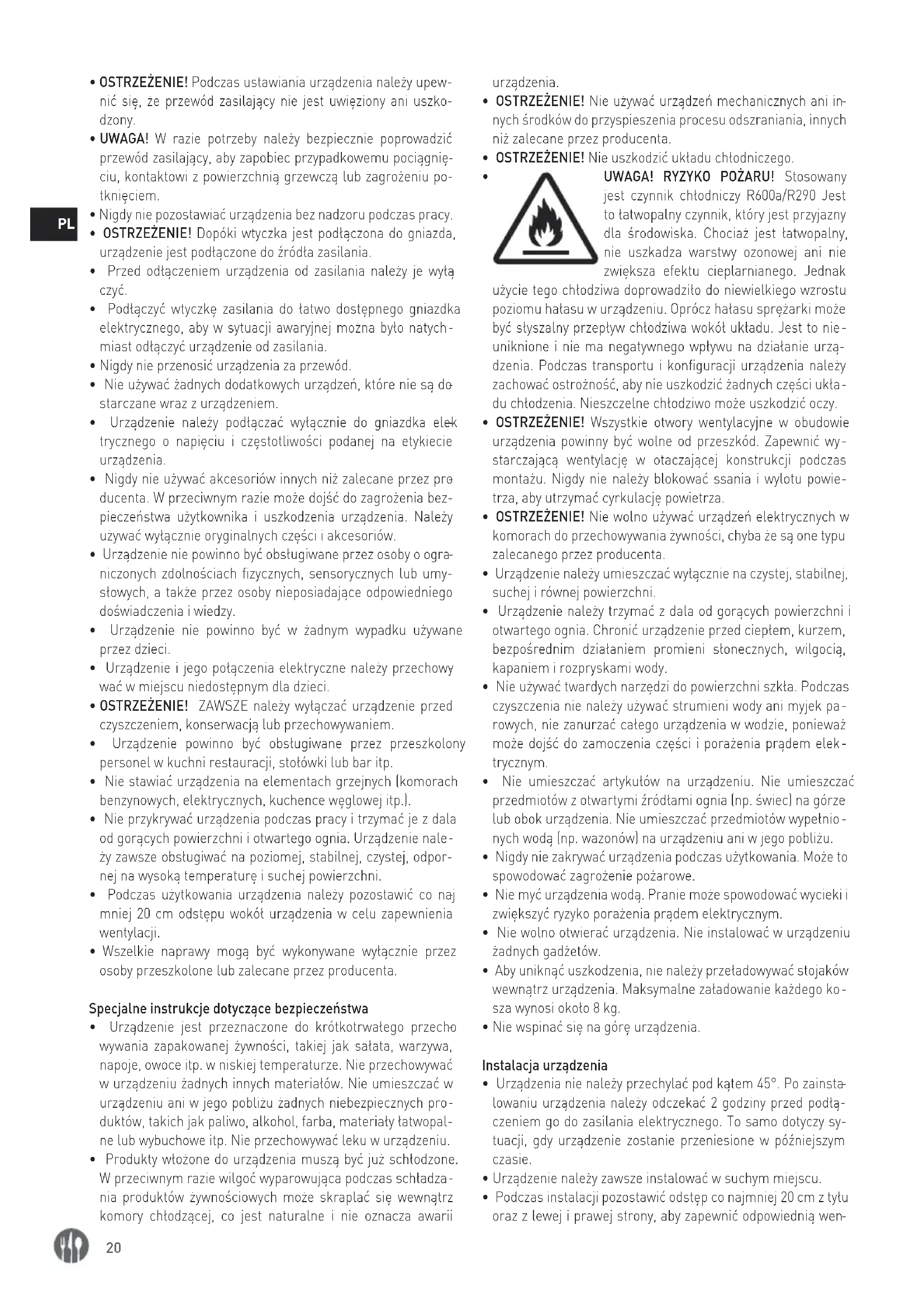 UWAGA! RYZYKO POŻARU! Stosowany jest czynnik chłodniczy R600a/R290 Jest to łatwopalny czynnik, który jest przyjazny dla środowiska. Chociaż jest łatwopalny, nie uszkadza warstwy ozonowej ani nie zwiększa efektu cieplarnianego. Jednak użycie tego chłodziwa doprowadziło do niewielkiego wzrostu poziomu hałasu w urządzeniu. Oprócz hałasu sprężarki może być słyszalny przepływ chłodziwa wokół układu. Jest to nie