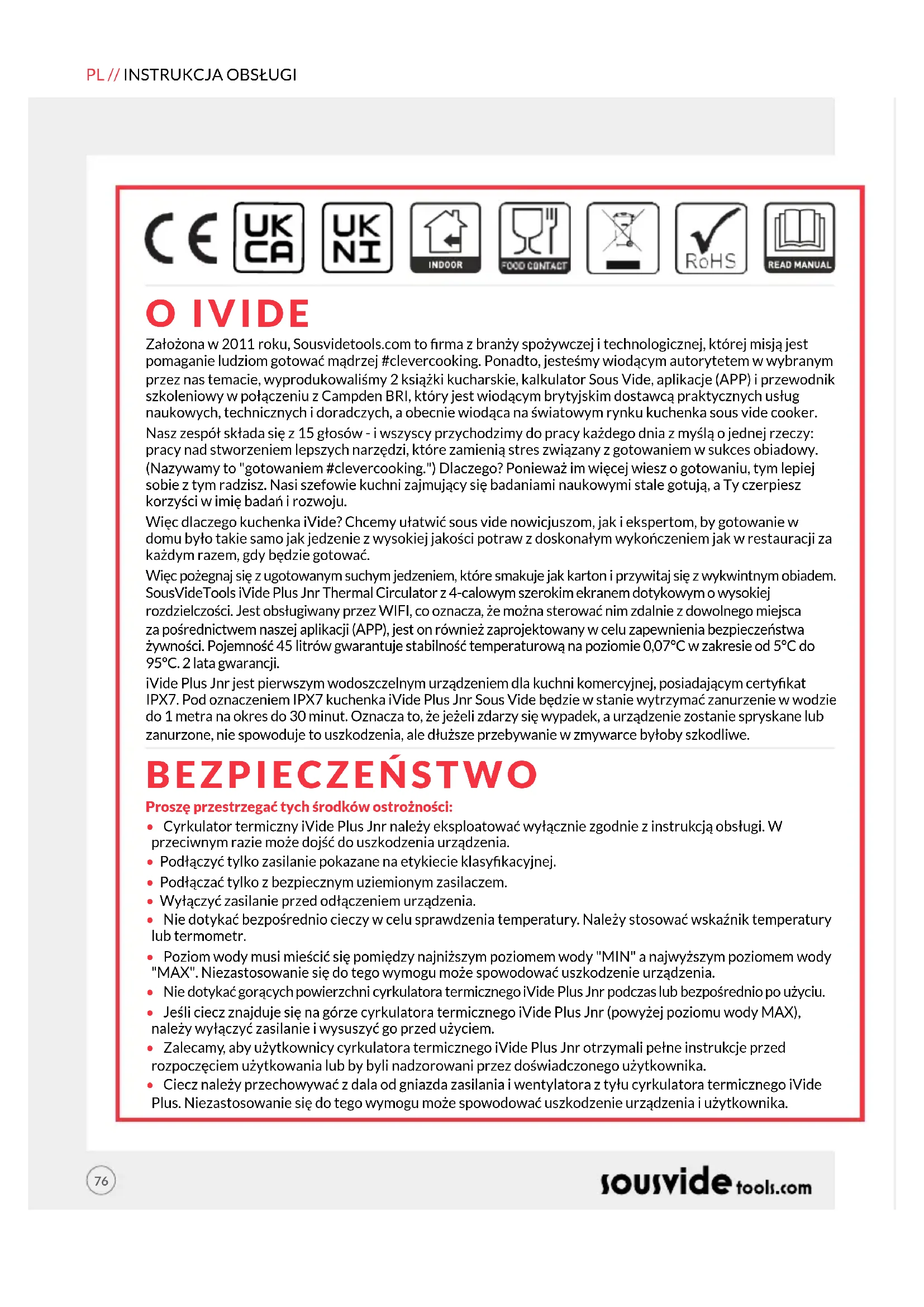 O IVIDE BEZPIECZEŃSTWO Założona w 2011 roku, Sousvidetools.com to rma z branży spożywczej i technologicznej, której misją jest pomaganie ludziom gotować mądrzej #clevercooking. Ponadto, jesteśmy wiodącym autorytetem w wybranym przez nas temacie, wyprodukowaliśmy 2 książki kucharskie, kalkulator Sous Vide, aplikacje (APP) i przewodnik szkoleniowy w połączeniu z Campden BRI, który jest wiodącym brytyjskim dostawcą praktycznych usług naukowych, technicznych i doradczych, a obecnie wiodąca na światowym rynku kuchenka sous vide cooker. Nasz zespół składa się z 15 głosów - i wszyscy przychodzimy do pracy każdego dnia z myślą o jednej rzeczy: pracy nad stworzeniem lepszych narzędzi, które zamienią stres związany z gotowaniem w sukces obiadowy. (Nazywamy to "gotowaniem #clevercooking.") Dlaczego? Ponieważ im więcej wiesz o gotowaniu, tym lepiej sobie z tym radzisz. Nasi szefowie kuchni zajmujący się badaniami naukowymi stale gotują, a Ty czerpiesz korzyści w imię badań i rozwoju. Więc dlaczego kuchenka iVide? Chcemy ułatwić sous vide nowicjuszom, jak i ekspertom, by gotowanie w domu było takie samo jak jedzenie z wysokiej jakości potraw z doskonałym wykończeniem jak w restauracji za każdym razem, gdy będzie gotować. Więc pożegnaj się z ugotowanym suchym jedzeniem, które smakuje jak karton i przywitaj się z wykwintnym obiadem. SousVideTools iVide Plus Jnr Thermal Circulator z 4-calowym szerokim ekranem dotykowym o wysokiej rozdzielczości. Jest obsługiwany przez WIFI, co oznacza, że można sterować nim zdalnie z dowolnego miejsca za pośrednictwem naszej aplikacji (APP), jest on również zaprojektowany w celu zapewnienia bezpieczeństwa żywności. Pojemność 45 litrów gwarantuje stabilność temperaturową na poziomie 0,07°C w zakresie od 5°C do 95°C. 2 lata gwarancji. iVide Plus Jnr jest pierwszym wodoszczelnym urządzeniem dla kuchni komercyjnej, posiadającym certykat IPX7. Pod oznaczeniem IPX7 kuchenka iVide Plus Jnr Sous Vide będzie w stanie wytrzymać zanurzenie w wodzie do 1 metra na okres do 30 minut. Oznacza to, że jeżeli zdarzy się wypadek, a urządzenie zostanie spryskane lub zanurzone, nie spowoduje to uszkodzenia, ale dłuższe przebywanie w zmywarce byłoby szkodliwe. Proszę przestrzegać tych środków ostrożności: