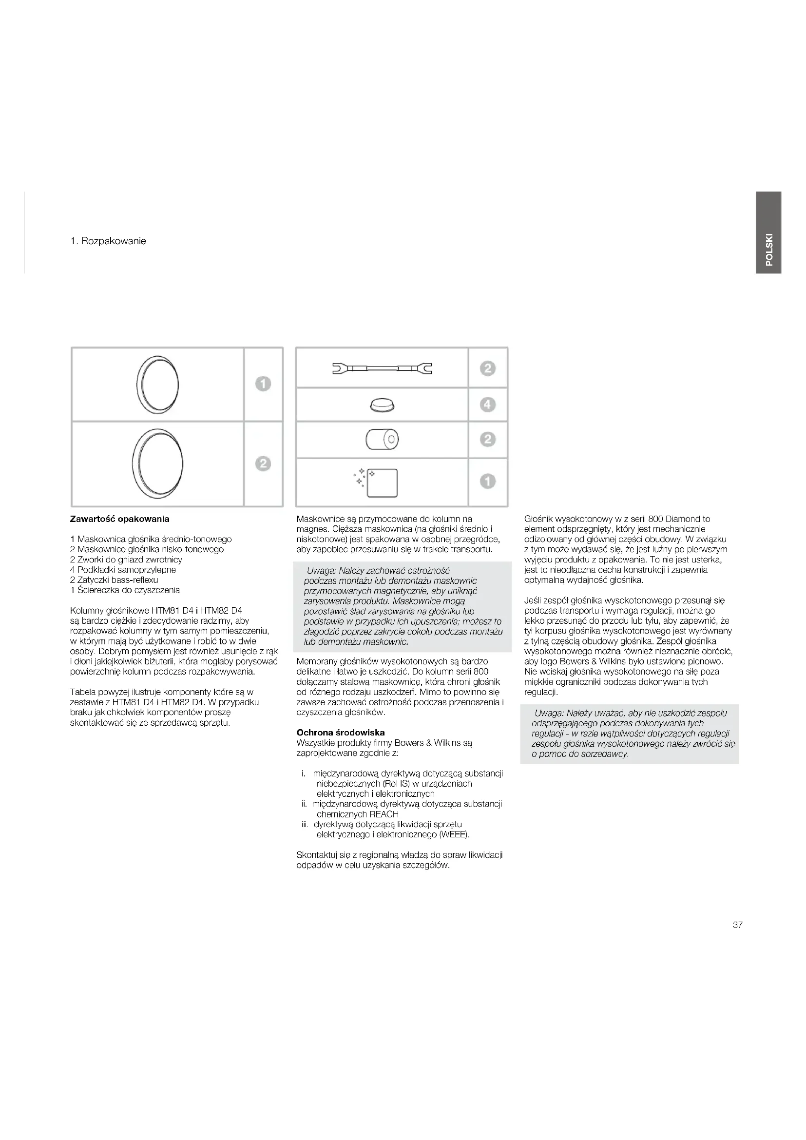 Zawartość opakowania 1 Maskownica głośnika średnio-tonowego 2 Maskownice głośnika nisko-tonowego 2 Zworki do gniazd zwrotnicy 4 Podkładki samoprzylepne 2 Zatyczki bass-reexu 1 Ściereczka do czyszczenia Kolumny głośnikowe HTM81 D4 i HTM82 D4 są bardzo ciężkie i zdecydowanie radzimy, aby rozpakować kolumny w tym samym pomieszczeniu, w którym mają być użytkowane i robić to w dwie osoby. Dobrym pomysłem jest również usunięcie z rąk i dłoni jakiejkolwiek biżuterii, która mogłaby porysować powierzchnię kolumn podczas rozpakowywania. Tabela powyżej ilustruje komponenty które są w zestawie z HTM81 D4 i HTM82 D4. W przypadku braku jakichkolwiek komponentów proszę skontaktować się ze sprzedawcą sprzętu. Maskownice są przymocowane do kolumn na magnes. Cięższa maskownica (na głośniki średnio i niskotonowe) jest spakowana w osobnej przegródce, aby zapobiec przesuwaniu się w trakcie transportu. Uwaga:Należyzachowaćostrożność podczasmontażulubdemontażumaskownic przymocowanychmagnetycznie,abyuniknąć zarysowaniaproduktu.Maskownicemogą pozostawićśladzarysowanianagłośnikulub podstawiewprzypadkuichupuszczenia;możeszto złagodzićpoprzezzakryciecokołupodczasmontażu lubdemontażumaskownic. Membrany głośników wysokotonowych są bardzo delikatne i łatwo je uszkodzić. Do kolumn serii 800 dołączamy stalową maskownicę, która chroni głośnik od różnego rodzaju uszkodzeń. Mimo to powinno się zawsze zachować ostrożność podczas przenoszenia i czyszczenia głośników. Ochrona środowiska Wszystkie produkty rmy Bowers & Wilkins są zaprojektowane zgodnie z: