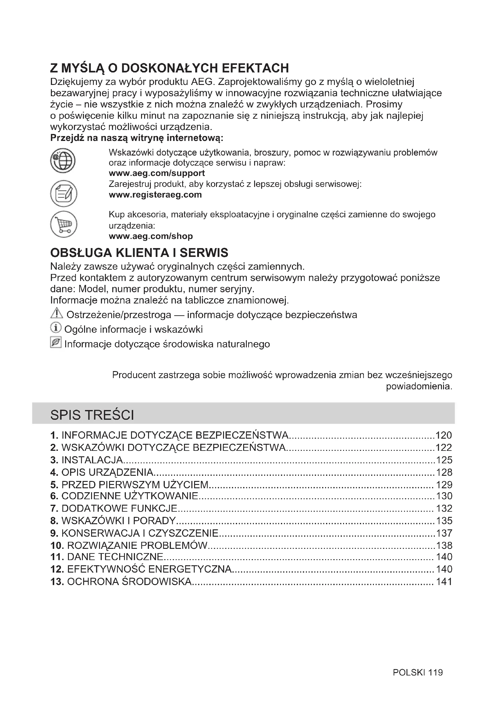 Należy zawsze używać oryginalnych części zamiennych. Przed kontaktem z autoryzowanym centrum serwisowym należy przygotować poniższe dane: Model, numer produktu, numer seryjny. Informacje można znaleźć na tabliczce znamionowej. Ostrzeżenie/przestroga — informacje dotyczące bezpieczeństwa Ogólne informacje i wskazówki Informacje dotyczące środowiska naturalnego Producent zastrzega sobie możliwość wprowadzenia zmian bez wcześniejszego powiadomienia.