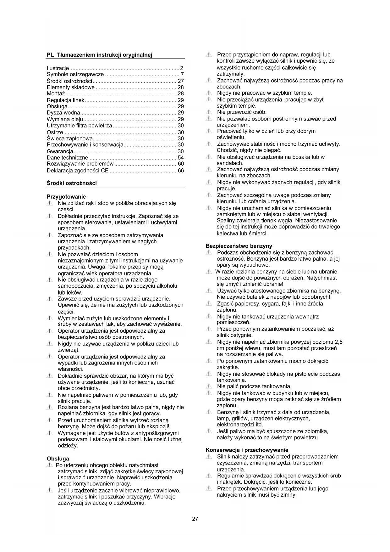 - Deklaracja zgodności CE Środki ostrożności Przygotowanie Nie zbliżać rąk i stóp w pobliże obracających się części. Dokładnie przeczytać instrukcje. Zapoznać się ze sposobem sterowania, ustawieniami i uchwytami urządzenia. Zapoznać się ze sposobem zatrzymywania urządzenia i zatrzymywaniem w nagłych przypadkach. Nie pozwalać dzieciom i osobom niezaznajomionym z tymi instrukcjami na używanie urządzenia. Uwaga: lokalne przepisy mogą ograniczać wiek operatora urządzenia. Nie obsługiwać urządzenia w razie złego samopoczucia, zmęczenia, po spożyciu alkoholu lub leków. Zawsze przed użyciem sprawdzić urządzenie. Upewnić się, że nie ma zużytych lub uszkodzonych części. Wymieniać zużyte lub uszkodzone elementy i śruby w zestawach tak, aby zachować wyważenie. Operator urządzenia jest odpowiedzialny za bezpieczeństwo osób postronnych. Nigdy nie używać urządzenia w pobliżu dzieci lub zwierząt. Operator urządzenia jest odpowiedzialny za wypadki lub zagrożenia innych osób i ich własności. Dokładnie sprawdzić obszar, na którym ma być używane urządzenie, jeśli to konieczne, usunąć obce przedmioty. Nie napełniać paliwem w pomieszczeniu lub, gdy silnik pracuje. Rozlana benzyna jest bardzo łatwo palna, nigdy nie napełniać zbiornika, gdy silnik jest gorący. Przed uruchomieniem silnika wytrzeć rozlaną benzynę. Może dojść do pożaru lub eksplozji! Wymagane jest użycie butów z antypoślizgowymi podeszwami i stalowymi okuciami. Nie nosić luźnej odzieży. Obsługa Po uderzeniu obcego obiektu natychmiast zatrzymać silnik, zdjąć zakrętkę świecy zapłonowej i sprawdzić urządzenie. Naprawić uszkodzenia przed kontynuowaniem pracy. Jeśli urządzenie zacznie wibrować nieprawidłowo, zatrzymać silnik i poszukać przyczyny. Wibracje zazwyczaj świadczą o uszkodzeniu. Przed przystąpieniem do napraw, regulacji lub kontroli zawsze wyłączać silnik i upewnić się, że wszystkie ruchome części całkowicie się zatrzymały. Zachować najwyższą ostrożność podczas pracy na zboczach. Nigdy nie pracować w szybkim tempie. Nie przeciążać urządzenia, pracując w zbyt szybkim tempie. Nie przewozić osób. Nie pozwalać osobom postronnym stawać przed urządzeniem. Pracować tylko w dzień lub przy dobrym oświetleniu. Zachowywać stabilność i mocno trzymać uchwyty. Chodzić, nigdy nie biegać. Nie obsługiwać urządzenia na bosaka lub w sandałach. Zachować najwyższą ostrożność podczas zmiany kierunku na zboczach. Nigdy nie wykonywać żadnych regulacji, gdy silnik pracuje. Zachować szczególną uwagę podczas zmiany kierunku lub cofania urządzenia. Nigdy nie uruchamiać silnika w pomieszczeniu zamkniętym lub w miejscu o słabej wentylacji. Spaliny zawierają tlenek węgla. Niezastosowanie się do tej instrukcji może doprowadzić do trwałego kalectwa lub śmierci. Bezpieczeństwo benzyny Podczas obchodzenia się z benzyną zachować ostrożność. Benzyna jest bardzo łatwo palna, a jej opary są wybuchowe. W razie rozlania benzyny na siebie lub na ubranie może dojść do poważnych obrażeń. Natychmiast się umyć i zmienić ubranie! Używać tylko atestowanego zbiornika na benzynę. Nie używać butelek z napojów lub podobnych! Zgasić papierosy, cygara, fajki i inne źródła zapłonu. Nigdy nie tankować urządzenia wewnątrz pomieszczeń. Przed ponownym zatankowaniem poczekać, aż silnik ostygnie. Nigdy nie napełniać zbiornika powyżej poziomu 2,5 cm poniżej wlewu, musi tam pozostać przestrzeń na rozszerzanie się paliwa. Po ponownym zatankowaniu mocno dokręcić zakrętkę. Nigdy nie stosować blokady na pistolecie podczas tankowania. Nie palić podczas tankowania. Nigdy nie tankować w budynku lub w miejscu, gdzie opary benzyny mogą zetknąć się ze źródłem zapłonu. Benzynę i silnik trzymać z dala od urządzenia, lamp, grillów, urządzeń elektrycznych, elektronarzędzi itd. Jeśli paliwo ma być spuszczone ze zbiornika, należy wykonać to na świeżym powietrzu. Konserwacja i przechowywanie Silnik należy zatrzymać przed przeprowadzaniem czyszczenia, zmianą narzędzi, transportem urządzenia. Regularnie sprawdzać dokręcenie wszystkich śrub i nakrętek. Dokręcić, jeśli to konieczne. Przed przechowywaniem urządzenia lub jego nakryciem silnik musi być zimny.28 Jeśli urządzenie nie jest używane przez dłuższy czas, prosimy zapoznać się z tym podręcznikiem . Wszystkie etykiety należy utrzymywać w dobrym stanie i w razie konieczności wymieniać. Używać tylko oryginalnych części zamiennych lub akcesoriów. W przypadku użycia nieoryginalnych części lub akcesoriów wygasa wszelka odpowiedzialność. Inne Silnik nie jest napełniony olejem. Przyrządy sterujące zamocowane fabrycznie, jak linka sprzęgła na uchwycie, nie mogą być usuwane lub odsłaniane. Paliwo można spuszczać ze zbiornika tylko na zewnątrz pomieszczeń. Benzyna jest bardzo łatwo palna, a jej opary są wybuchowe. Upewnić się, że podczas transportu urządzenie jest dobrze przymocowane. Nie wolno wyrzucać urządzeń elektrycznych ze zwykłymi odpadami domowymi. Urządzenie to należy oddać do lokalnego punktu recyklingu, by zostało zutylizowane w bezpieczny sposób. Kosiarka została wyprodukowana zgodnie z najnowszymi przepisami dotyczącymi bezpieczeństwa. Obejmuje to zastosowanie hamulca, który zatrzymuje silnik oraz ostrze w ciągu 3 sekund od jego uruchomienia. Aby zagwarantować bezpieczeństwo, należy bezwzględnie przestrzegać wszelkich środków ostrożności. Podczas montażu kosiarki należy korzystać z poniższego opisu. Elementy składowe Patrz oznaczenia na ilustracji 1 Uwaga: w rzeczywistości urządzenie może się nieznacznie różnić A. Uchwyt sterujący B. Uchwyt hamulca silnika C. Linka rozrusznika D. Nakrętka motylkowa E. Osłona dla wylotu tylniego F. Dysza wodna G. Pojemnik na trawę H. Korek napełniania paliwem p. 66
