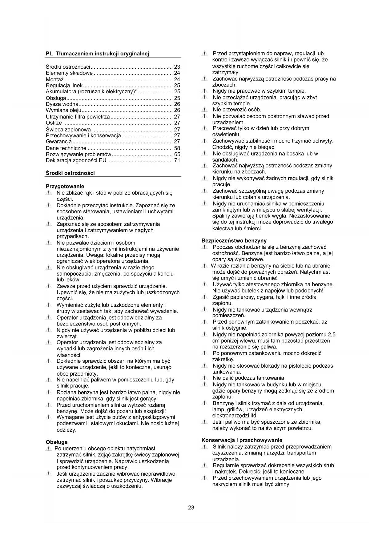 - Deklaracja zgodności EU Środki ostrożności Przygotowanie Nie zbliżać rąk i stóp w pobliże obracających się części. Dokładnie przeczytać instrukcje. Zapoznać się ze sposobem sterowania, ustawieniami i uchwytami urządzenia. Zapoznać się ze sposobem zatrzymywania urządzenia i zatrzymywaniem w nagłych przypadkach. Nie pozwalać dzieciom i osobom niezaznajomionym z tymi instrukcjami na używanie urządzenia. Uwaga: lokalne przepisy mogą ograniczać wiek operatora urządzenia. Nie obsługiwać urządzenia w razie złego samopoczucia, zmęczenia, po spożyciu alkoholu lub leków. Zawsze przed użyciem sprawdzić urządzenie. Upewnić się, że nie ma zużytych lub uszkodzonych części. Wymieniać zużyte lub uszkodzone elementy i śruby w zestawach tak, aby zachować wyważenie. Operator urządzenia jest odpowiedzialny za bezpieczeństwo osób postronnych. Nigdy nie używać urządzenia w pobliżu dzieci lub zwierząt. Operator urządzenia jest odpowiedzialny za wypadki lub zagrożenia innych osób i ich własności. Dokładnie sprawdzić obszar, na którym ma być używane urządzenie, jeśli to konieczne, usunąć obce przedmioty. Nie napełniać paliwem w pomieszczeniu lub, gdy silnik pracuje. Rozlana benzyna jest bardzo łatwo palna, nigdy nie napełniać zbiornika, gdy silnik jest gorący. Przed uruchomieniem silnika wytrzeć rozlaną benzynę. Może dojść do pożaru lub eksplozji! Wymagane jest użycie butów z antypoślizgowymi podeszwami i stalowymi okuciami. Nie nosić luźnej odzieży. Obsługa Po uderzeniu obcego obiektu natychmiast zatrzymać silnik, zdjąć zakrętkę świecy zapłonowej i sprawdzić urządzenie. Naprawić uszkodzenia przed kontynuowaniem pracy. Jeśli urządzenie zacznie wibrować nieprawidłowo, zatrzymać silnik i poszukać przyczyny. Wibracje zazwyczaj świadczą o uszkodzeniu. Przed przystąpieniem do napraw, regulacji lub kontroli zawsze wyłączać silnik i upewnić się, że wszystkie ruchome części całkowicie się zatrzymały. Zachować najwyższą ostrożność podczas pracy na zboczach. Nigdy nie pracować w szybkim tempie. Nie przeciążać urządzenia, pracując w zbyt szybkim tempie. Nie przewozić osób. Nie pozwalać osobom postronnym stawać przed urządzeniem. Pracować tylko w dzień lub przy dobrym oświetleniu. Zachowywać stabilność i mocno trzymać uchwyty. Chodzić, nigdy nie biegać. Nie obsługiwać urządzenia na bosaka lub w sandałach. Zachować najwyższą ostrożność podczas zmiany kierunku na zboczach. Nigdy nie wykonywać żadnych regulacji, gdy silnik pracuje. Zachować szczególną uwagę podczas zmiany kierunku lub cofania urządzenia. Nigdy nie uruchamiać silnika w pomieszczeniu zamkniętym lub w miejscu o słabej wentylacji. Spaliny zawierają tlenek węgla. Niezastosowanie się do tej instrukcji może doprowadzić do trwałego kalectwa lub śmierci. Bezpieczeństwo benzyny Podczas obchodzenia się z benzyną zachować ostrożność. Benzyna jest bardzo łatwo palna, a jej opary są wybuchowe. W razie rozlania benzyny na siebie lub na ubranie może dojść do poważnych obrażeń. Natychmiast się umyć i zmienić ubranie! Używać tylko atestowanego zbiornika na benzynę. Nie używać butelek z napojów lub podobnych! Zgasić papierosy, cygara, fajki i inne źródła zapłonu. Nigdy nie tankować urządzenia wewnątrz pomieszczeń. Przed ponownym zatankowaniem poczekać, aż silnik ostygnie. Nigdy nie napełniać zbiornika powyżej poziomu 2,5 cm poniżej wlewu, musi tam pozostać przestrzeń na rozszerzanie się paliwa. Po ponownym zatankowaniu mocno dokręcić zakrętkę. Nigdy nie stosować blokady na pistolecie podczas tankowania. Nie palić podczas tankowania. Nigdy nie tankować w budynku lub w miejscu, gdzie opary benzyny mogą zetknąć się ze źródłem zapłonu. Benzynę i silnik trzymać z dala od urządzenia, lamp, grillów, urządzeń elektrycznych, elektronarzędzi itd. Jeśli paliwo ma być spuszczone ze zbiornika, należy wykonać to na świeżym powietrzu. Konserwacja i przechowywanie Silnik należy zatrzymać przed przeprowadzaniem czyszczenia, zmianą narzędzi, transportem urządzenia. Regularnie sprawdzać dokręcenie wszystkich śrub i nakrętek. Dokręcić, jeśli to konieczne. Przed przechowywaniem urządzenia lub jego nakryciem silnik musi być zimny.24 Jeśli urządzenie nie jest używane przez dłuższy czas, prosimy zapoznać się z tym podręcznikiem . Wszystkie etykiety należy utrzymywać w dobrym stanie i w razie konieczności wymieniać. Używać tylko oryginalnych części zamiennych lub akcesoriów. W przypadku użycia nieoryginalnych części lub akcesoriów wygasa wszelka odpowiedzialność. Inne Silnik nie jest napełniony olejem. Przyrządy sterujące zamocowane fabrycznie, jak linka sprzęgła na uchwycie, nie mogą być usuwane lub odsłaniane. Paliwo można spuszczać ze zbiornika tylko na zewnątrz pomieszczeń. Benzyna jest bardzo łatwo palna, a jej opary są wybuchowe. Upewnić się, że podczas transportu urządzenie jest dobrze przymocowane. Nie wolno wyrzucać urządzeń elektrycznych ze zwykłymi odpadami domowymi. Urządzenie to należy oddać do lokalnego punktu recyklingu, by zostało zutylizowane w bezpieczny sposób. Kosiarka została wyprodukowana zgodnie z najnowszymi przepisami dotyczącymi bezpieczeństwa. Obejmuje to zastosowanie hamulca, który zatrzymuje silnik oraz ostrze w ciągu 3 sekund od jego uruchomienia. Aby zagwarantować bezpieczeństwo, należy bezwzględnie przestrzegać wszelkich środków ostrożności. Podczas montażu kosiarki należy korzystać z poniższego opisu. Elementy składowe Patrz oznaczenia na ilustracji Uwaga: w rzeczywistości urządzenie może się nieznacznie różnić A. Uchwyt sterujący * B. Uchwyt hamulca silnika C. Linka rozrusznika D. Nakrętka motylkowa E. Osłona z nakładkami dla wylotu tylniego * F. Dysza wodna * G. Pojemnik na trawę H. Korek napełniania paliwem p. 71