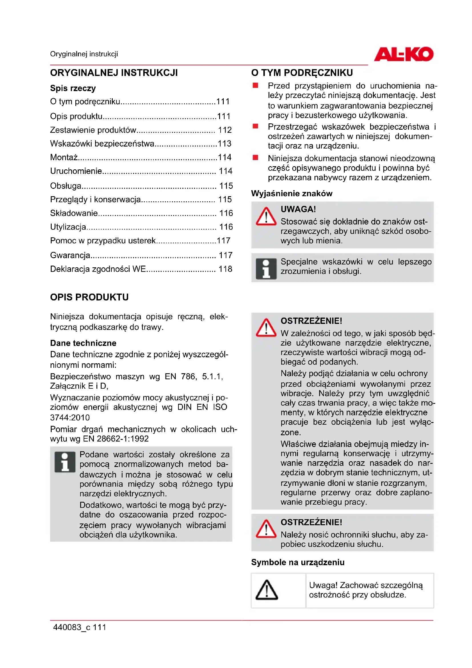 Przed przystąpieniem do uruchomienia na- leży przeczytać niniejszą dokumentację. Jest to warunkiem zagwarantowania bezpiecznej pracy i bezusterkowego użytkowania. Przestrzegać wskazówek bezpieczeństwa i ostrzeżeń zawartych w niniejszej dokumen- tacji oraz na urządzeniu. Niniejsza dokumentacja stanowi nieodzowną część opisywanego produktu i powinna być przekazana nabywcy razem z urządzeniem. Wyjaśnienie znaków UWAGA! Stosować się dokładnie do znaków ost- rzegawczych, aby uniknąć szkód osobo- wych lub mienia. ADVICE Specjalne wskazówki w celu lepszego zrozumienia i obsługi. OPIS PRODUKTU Niniejsza dokumentacja opisuje ręczną, elek- tryczną podkaszarkę do trawy. Dane techniczne Dane techniczne zgodnie z poniżej wyszczegól- nionymi normami: Bezpieczeństwo maszyn wg EN 786, 5.1.1, Załącznik E i D, Wyznaczanie poziomów mocy akustycznej i po- ziomów energii akustycznej wg DIN EN ISO 3744:2010 Pomiar drgań mechanicznych w okolicach uch- wytu wg EN 28662-1:1992 ADVICE Podane wartości zostały określone za pomocą znormalizowanych metod ba- dawczych i można je stosować w celu porównania między sobą różnego typu narzędzi elektrycznych. Dodatkowo, wartości te mogą być przy- datne do oszacowania przed rozpoc- zęciem pracy wywołanych wibracjami obciążeń dla użytkownika. OSTRZEŹENIE! W zależności od tego, w jaki sposób będ- zie użytkowane narzędzie elektryczne, rzeczywiste wartości wibracji mogą od- biegać od podanych. Należy podjąć działania w celu ochrony przed obciążeniami wywołanymi przez wibracje. Należy przy tym uwzględnić cały czas trwania pracy, a więc także mo- menty, w których narzędzie elektryczne pracuje bez obciążenia lub jest wyłąc- zone. Właściwe działania obejmują miedzy in- nymi regularną konserwację i utrzymy- wanie narzędzia oraz nasadek do nar- zędzia w dobrym stanie technicznym, ut- rzymywanie dłoni w stanie rozgrzanym, regularne przerwy oraz dobre zaplano- wanie przebiegu pracy. OSTRZEŹENIE! Należy nosić ochronniki słuchu, aby za- pobiec uszkodzeniu słuchu. Symbole na urządzeniu Uwaga! Zachować szczególną ostrożność przy obsłudze.pl Opis produktu 112 GTE 350 / 450 / 550 Przed uruchomieniem urządze- nia należy przeczytać instrukcję obsługi! Niebezpieczeństwo spowo- dowane przedmiotami wyrzu- canymi z dużą siłą! Nie dopuszczać osób trzecich do obszaru zagrożenia. Odstęp pomiędzy urządzeniem i osobami postronnymi musi wynosić co najmniej 15 m. Nie wystawiać urządzenia na działanie wilgoci lub mokrego otoczenia. Nosić okulary ochronne, hełm ochronny, stosować środki ochrony słuchu. Wtyczkę należy natychmiast odłączyć od sieci, gdy kabel przedłużający został uszkod- zony lub przecięty! Regulowany trzonek teleskopowy Podkaszarka jest wyposażona w regulowany trzonek teleskopowy. W ten sposób można dosto- sować urządzenie do indywidualnych rozmiarów ciała i obracać głowicę z silnikiem. Obrotowa i regulowana głowica przycinająca GTE 450 i 550 jest wyposażona w obrotową gło- wicę przycinającą z regulacją pochylenia. Tippautomatik W głowicy żyłki zintegrowano moduł Tippautoma- tik (8-4) dzięki czemu można regulować długość linek tnących w trakcie pracy silnika. Urządzenia zabezpieczające i ochronne Zabezpieczenie przed dziećmi Otwór o średnicy 5 mm umieszczony na wyłącz- niku samoczynnym silnikowym przewidziano na zamocowanie kłódki*. Kłódka zapobiega niech- cianemu uruchomieniu urządzenia.