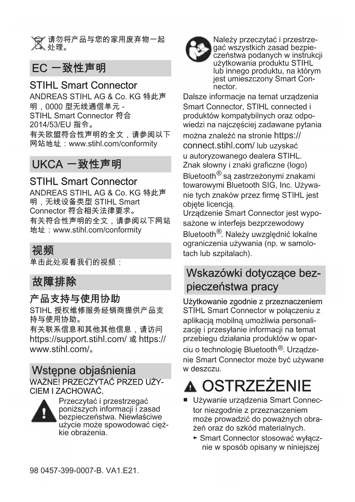 CIEM I ZACHOWAĆ. Przeczytać i przestrzegać poniższych informacji i zasad bezpieczeństwa. Niewłaściwe użycie może spowodować cięż‐ kie obrażenia. Należy przeczytać i przestrze‐ gać wszystkich zasad bezpie‐ czeństwa podanych w instrukcji użytkowania produktu STIHL lub innego produktu, na którym jest umieszczony Smart Con‐ nector. Dalsze informacje na temat urządzenia Smart Connector, STIHL connected i produktów kompatybilnych oraz odpo‐ wiedzi na najczęściej zadawane pytania można znaleźć na stronie https:// connect.stihl.com/ lub uzyskać u autoryzowanego dealera STIHL. Znak słowny i znaki graficzne (logo) Bluetooth