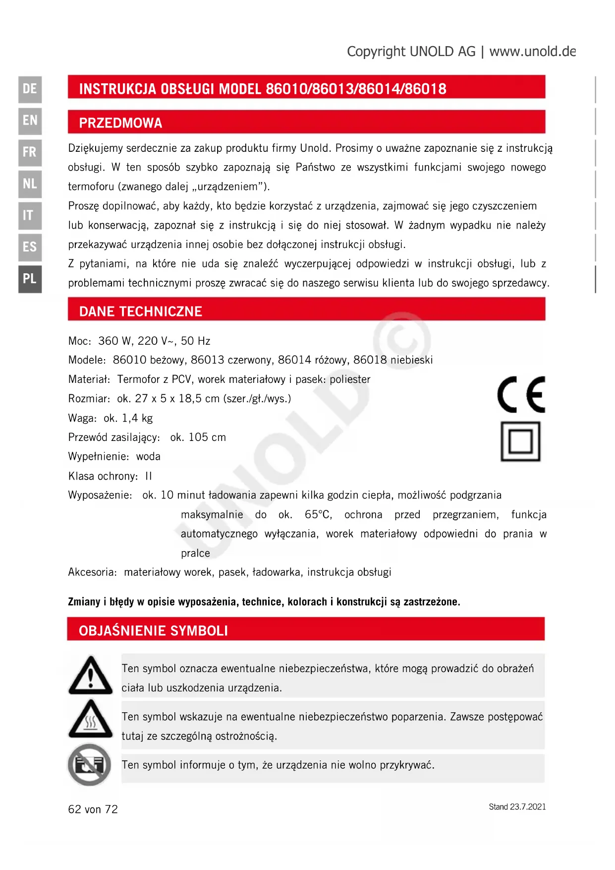 Ten symbol oznacza ewentualne niebezpieczeństwa, które mogą prowadzić do obrażeń ciała lub uszkodzenia urządzenia. Ten symbol wskazuje na ewentualne niebezpieczeństwo poparzenia. Zawsze postępować tutaj ze szczególną ostrożnością. Ten symbol informuje o tym, że urządzenia nie wolno przykrywać. PRZEDMOWA Dziękujemy serdecznie za zakup produktu firmy Unold. Prosimy o uważne zapoznanie się z instrukcją obsługi. W ten sposób szybko zapoznają się Państwo ze wszystkimi funkcjami swojego nowego termoforu (zwanego dalej „urządzeniem”). Proszę dopilnować, aby każdy, kto będzie korzystać z urządzenia, zajmować się jego czyszczeniem lub konserwacją, zapoznał się z instrukcją i się do niej stosował. W żadnym wypadku nie należy przekazywać urządzenia innej osobie bez dołączonej instrukcji obsługi. Z pytaniami, na które nie uda się znaleźć wyczerpującej odpowiedzi w instrukcji obsługi, lub z problemami technicznymi proszę zwracać się do naszego serwisu klienta lub do swojego sprzedawcy. Copyright UNOLD AG | www.unold.de UNOLD ©Stand 23.7.2021 63 von 72