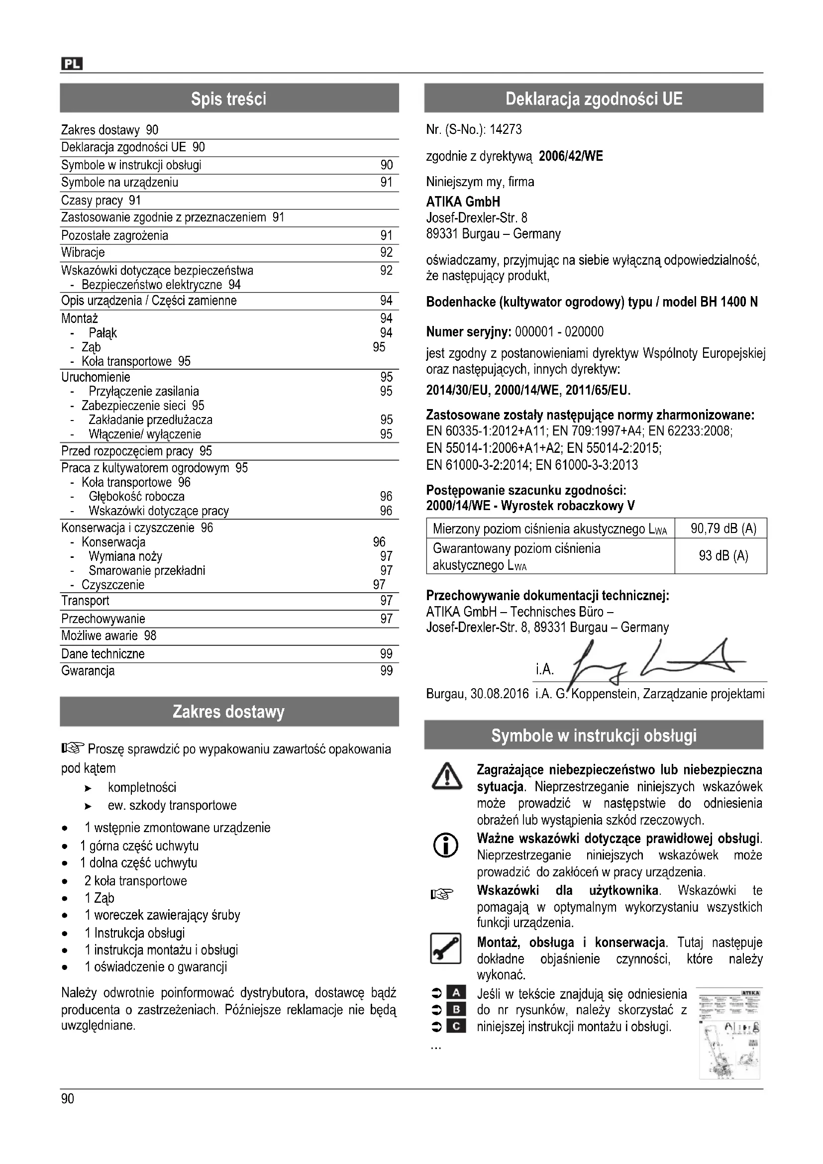 93 dB (A) Przechowywanie dokumentacji technicznej: ATIKA GmbH – Technisches Büro – Josef-Drexler-Str. 8, 89331 Burgau – Germany
