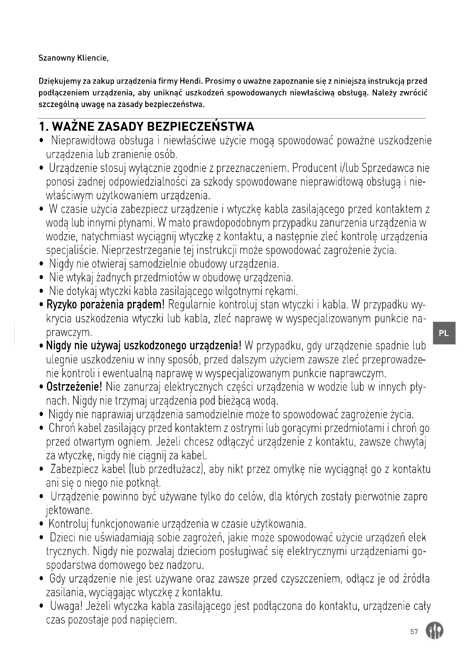 Dziekujemy za zakup urzadzenia firmy Hendi. Prosimy o uwazne zapoznanie sie z niniejsza instrukcja przy podączeniem urzadzenia, aby uniknac uszkodzen spowodowanych niewtasciwa obstuga. Nalezy zwróci szczególna uwage nazasady bezpieczność.