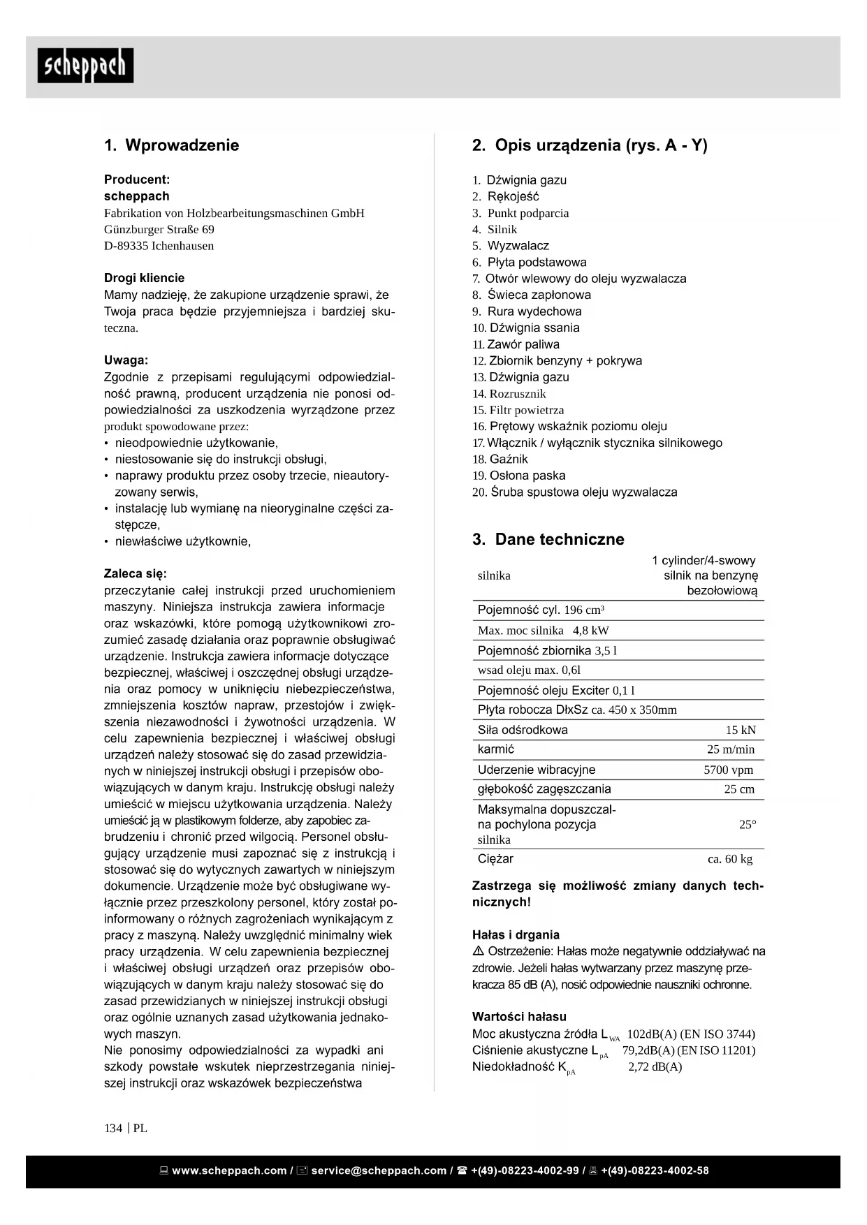 - niewłaściwe użytkownie, Zaleca się: przeczytanie całej instrukcji przed uruchomieniem maszyny. Niniejsza instrukcja zawiera informacje oraz wskazówki, które pomogą użytkownikowi zro- zumieć zasadę działania oraz poprawnie obsługiwać urządzenie. Instrukcja zawiera informacje dotyczące bezpiecznej, właściwej i oszczędnej obsługi urządze- nia oraz pomocy w uniknięciu niebezpieczeństwa, zmniejszenia kosztów napraw, przestojów i zwięk- szenia niezawodności i żywotności urządzenia. W celu zapewnienia bezpiecznej i właściwej obsługi urządzeń należy stosować się do zasad przewidzia- nych w niniejszej instrukcji obsługi i przepisów obo- wiązujących w danym kraju. Instrukcję obsługi należy umieścić w miejscu użytkowania urządzenia. Należy umieścić ją w plastikowym folderze, aby zapobiec za- brudzeniu i chronić przed wilgocią. Personel obsłu- gujący urządzenie musi zapoznać się z instrukcją i stosować się do wytycznych zawartych w niniejszym dokumencie. Urządzenie może być obsługiwane wy- łącznie przez przeszkolony personel, który został po- informowany o różnych zagrożeniach wynikającym z pracy z maszyną. Należy uwzględnić minimalny wiek pracy urządzenia. W celu zapewnienia bezpiecznej i właściwej obsługi urządzeń oraz przepisów obo- wiązujących w danym kraju należy stosować się do zasad przewidzianych w niniejszej instrukcji obsługi oraz ogólnie uznanych zasad użytkowania jednako- wych maszyn. Nie ponosimy odpowiedzialności za wypadki ani szkody powstałe wskutek nieprzestrzegania niniej- szej instrukcji oraz wskazówek bezpieczeństwa www.scheppach.com / service@scheppach.com / +(49)-08223-4002-99 / +(49)-08223-4002-58