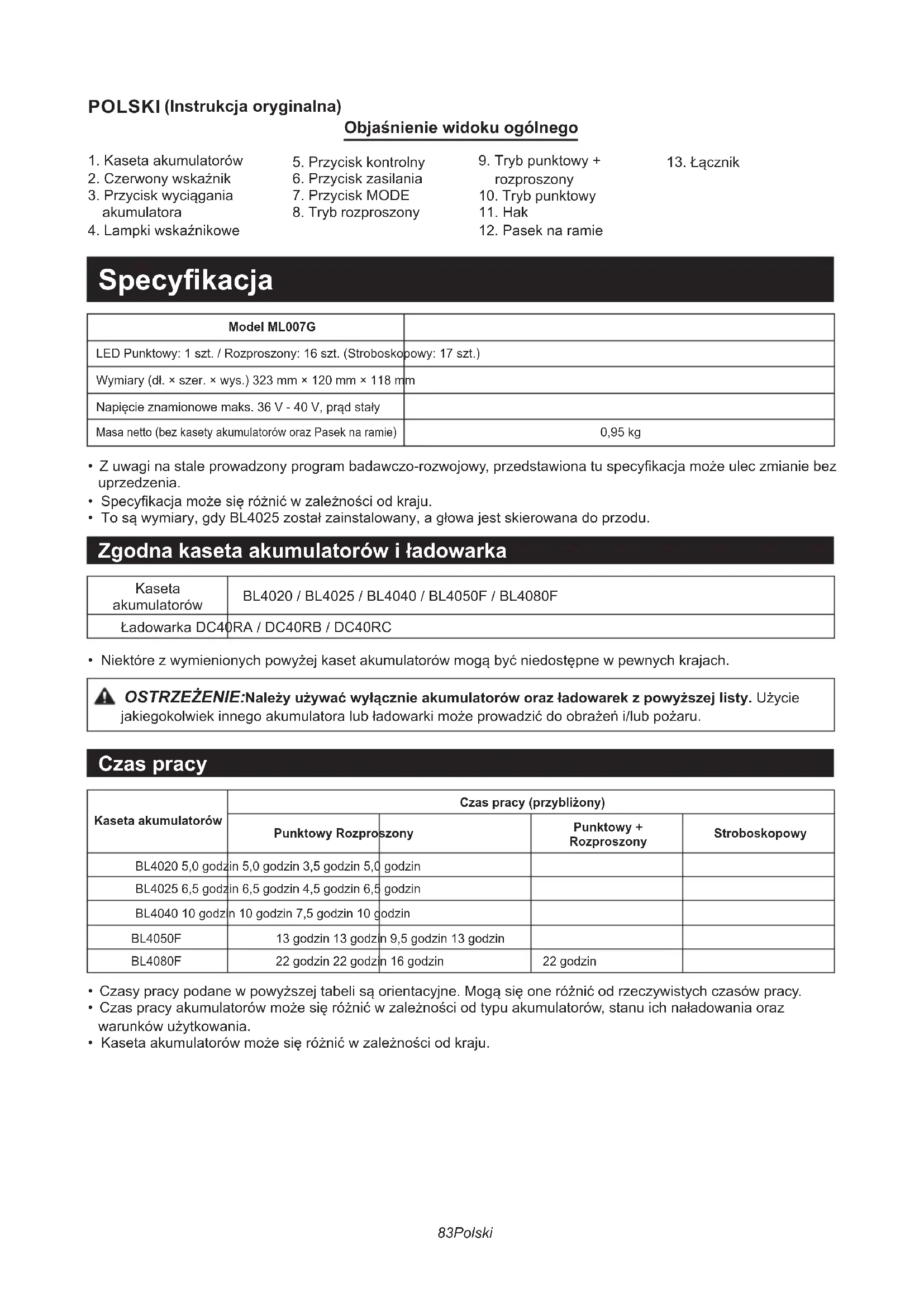 - Niektóre z wymienionych powyżej kaset akumulatorów mogą być niedostępne w pewnych krajach. OSTRZEŻENIE: Należy używać wyłącznie akumulatorów oraz ładowarek z powyższej listy. Użycie jakiegokolwiek innego akumulatora lub ładowarki może prowadzić do obrażeń i/lub pożaru. Czas pracy Kaseta akumulatorówCzas pracy (przybliżony)Punktowy RozproszonyPunktowy + RozproszonyStroboskopowyBL4020 5,0 godzin 5,0 godzin 3,5 godzin 5,0 godzinBL4025 6,5 godzin 6,5 godzin 4,5 godzin 6,5 godzinBL4040 10 godzin 10 godzin 7,5 godzin 10 godzinBL4050F 13 godzin 13 godzin 9,5 godzin 13 godzinBL4080F 22 godzin 22 godzin 16 godzin 22 godzin