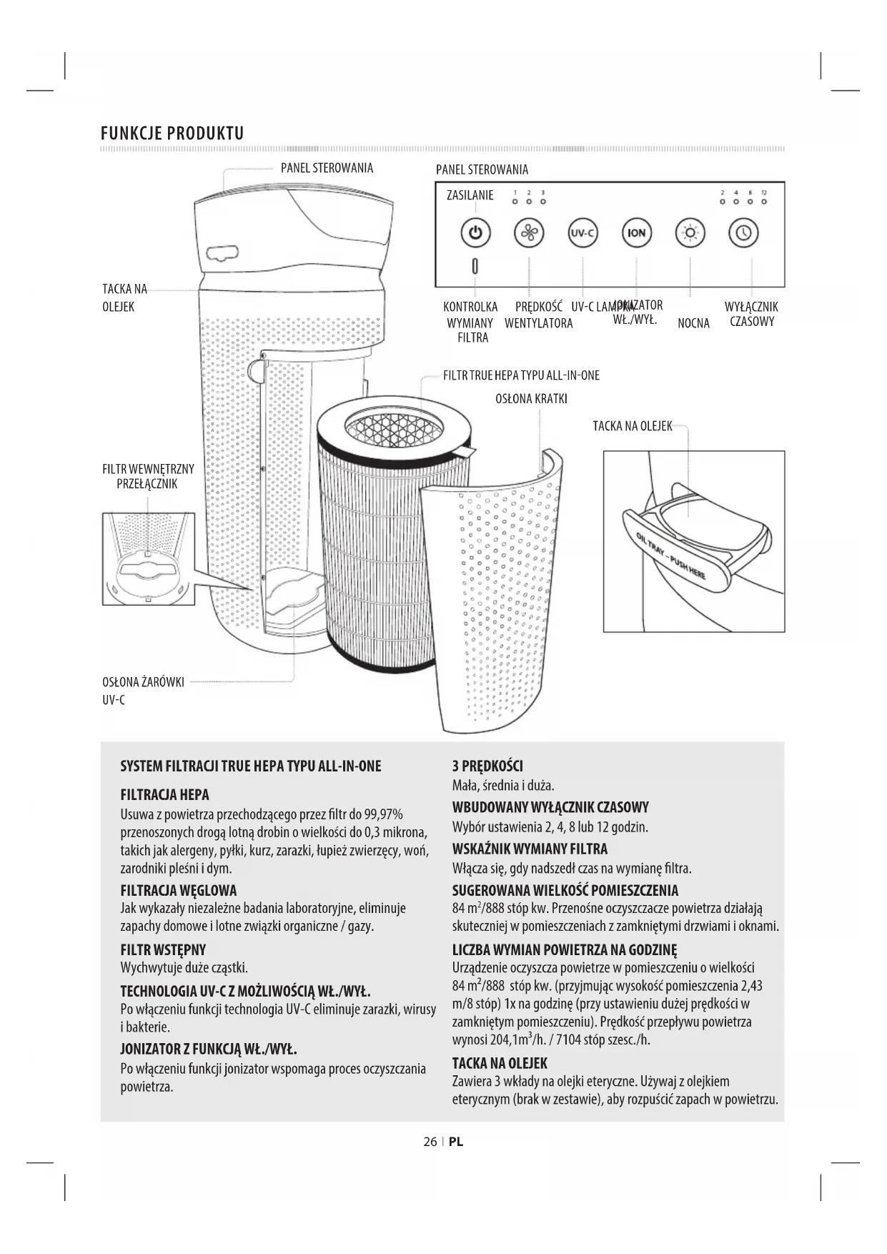 Wychwytuje duże cząstki. TECHNOLOGIA UV-C Z MOŻLIWOŚCIĄ WŁ./WYŁ. Po włączeniu funkcji technologia UV-C eliminuje zarazki, wirusy i bakterie. JONIZATOR Z FUNKCJĄ WŁ./WYŁ. Po włączeniu funkcji jonizator wspomaga proces oczyszczania powietrza.
