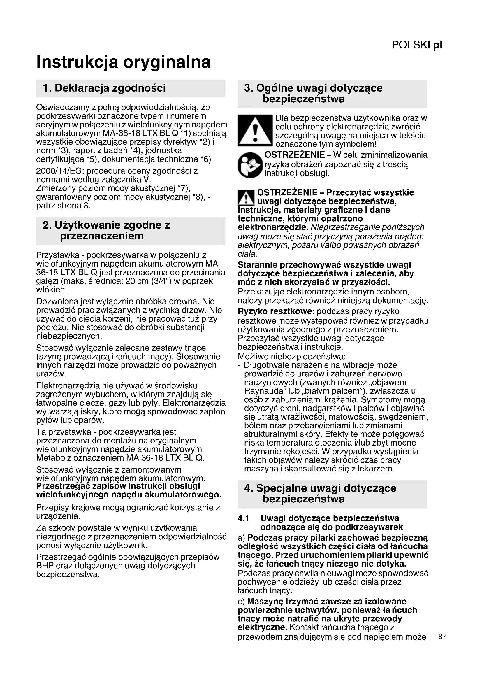 Instrukcja oryginalna Oświadczamy z pełną odpowiedzialnością, że podkrzesywarki oznaczone typem i numerem seryjnym w połączeniu z wielofunkcyjnym napędem akumulatorowym MA-36-18 LTX BL Q *1) spełniają wszystkie obowiązujące przepisy dyrektyw *2) i norm *3), raport z badań *4), jednostka certyfikująca *5), dokumentacja techniczna *6) 2000/14/EG: procedura oceny zgodności z normami według załącznika V. Zmierzony poziom mocy akustycznej *7), gwarantowany poziom mocy akustycznej *8), - patrz strona 3. Przystawka - podkrzesywarka w połączeniu z wielofunkcyjnym napędem akumulatorowym MA 36-18 LTX BL Q jest przeznaczona do przecinania gałęzi (maks. średnica: 20 cm (3/4") w poprzek włókien. Dozwolona jest wyłącznie obróbka drewna. Nie prowadzić prac związanych z wycinką drzew. Nie używać do ciecia korzeni, nie pracować tuż przy podłożu. Nie stosować do obróbki substancji niebezpiecznych. Stosować wyłącznie zalecane zestawy tnące (szynę prowadzącą i ł ańcuch tnący). Stosowanie innych narzędzi może prowadzić do poważnych urazów. Elektronarzędzia nie używać w środowisku zagrożonym wybuchem, w którym znajdują się łatwopalne ciecze, gazy lub pyły. Elektronarzędzia wytwarzają iskry, które mogą spowodować zapłon pyłów lub oparów. Ta przystawka - podkrzesywarka jest przeznaczona do montażu na oryginalnym wielofunkcyjnym napędzie akumulatorowym Metabo z oznaczeniem MA 36-18 LTX BL Q. Stosować wyłącznie z zamontowanym wielofunkcyjnym napędem akumulatorowym. Przestrzegać zapisów instrukcji obsługi wielofunkcyjnego napędu akumulatorowego. Przepisy krajowe mogą ograniczać korzystanie z urządzenia. Za szkody powstałe w wyniku użytkowania niezgodnego z przeznaczeniem odpowiedzialność ponosi wyłącznie użytkownik. Przestrzegać ogólnie obowiązujących przepisów BHP oraz dołączonych uwag dotyczących bezpieczeństwa. Dla bezpieczeństwa użytkownika oraz w celu ochrony elektronarzędzia zwrócić szczególną uwagę na miejsca w tekście oznaczone tym symbolem! OSTRZEŻENIE – W celu zminimalizowania ryzyka obrażeń zapoznać się z treścią instrukcji obsługi. OSTRZEŻENIE – Przeczytać wszystkie uwagi dotyczące bezpieczeństwa, instrukcje, materiały graficzne i dane techniczne, którymi opatrzono elektronarzędzie. Nieprzestrzeganie poniższych uwag może się stać przyczyną porażenia prądem elektrycznym, pożaru i/albo poważnych obrażeń ciała. Starannie przechowywać wszystkie uwagi dotyczące bezpieczeństwa i zalecenia, aby móc z nich skorzysta ć w przyszłości. Przekazując elektronarzędzie innym osobom, należy przekazać również niniejszą dokumentację. Ryzyko resztkowe: podczas pracy ryzyko resztkowe może występować również w przypadku użytkowania zgodnego z przeznaczeniem. Przeczytać wszystkie uwagi dotyczące bezpieczeństwa i instrukcje. Możliwe niebezpieczeństwa: -Długotrwałe narażenie na wibracje może prowadzić do urazów i zaburzeń nerwowo- naczyniowych (zwanych również „objawem Raynauda” lub „białym palcem”), zwłaszcza u osób z zaburzeniami krążenia. Symptomy mogą dotyczyć dłoni, nadgarstków i palców i objawiać się utratą wrażliwości, matowością, swędzeniem, bólem oraz przebarwieniami lub zmianami strukturalnymi skóry. Efekty te mo że potęgować niska temperatura otoczenia i/lub zbyt mocne trzymanie rękojeści. W przypadku wystąpienia takich objawów należy skrócić czas pracy maszyną i skonsultować się z lekarzem.