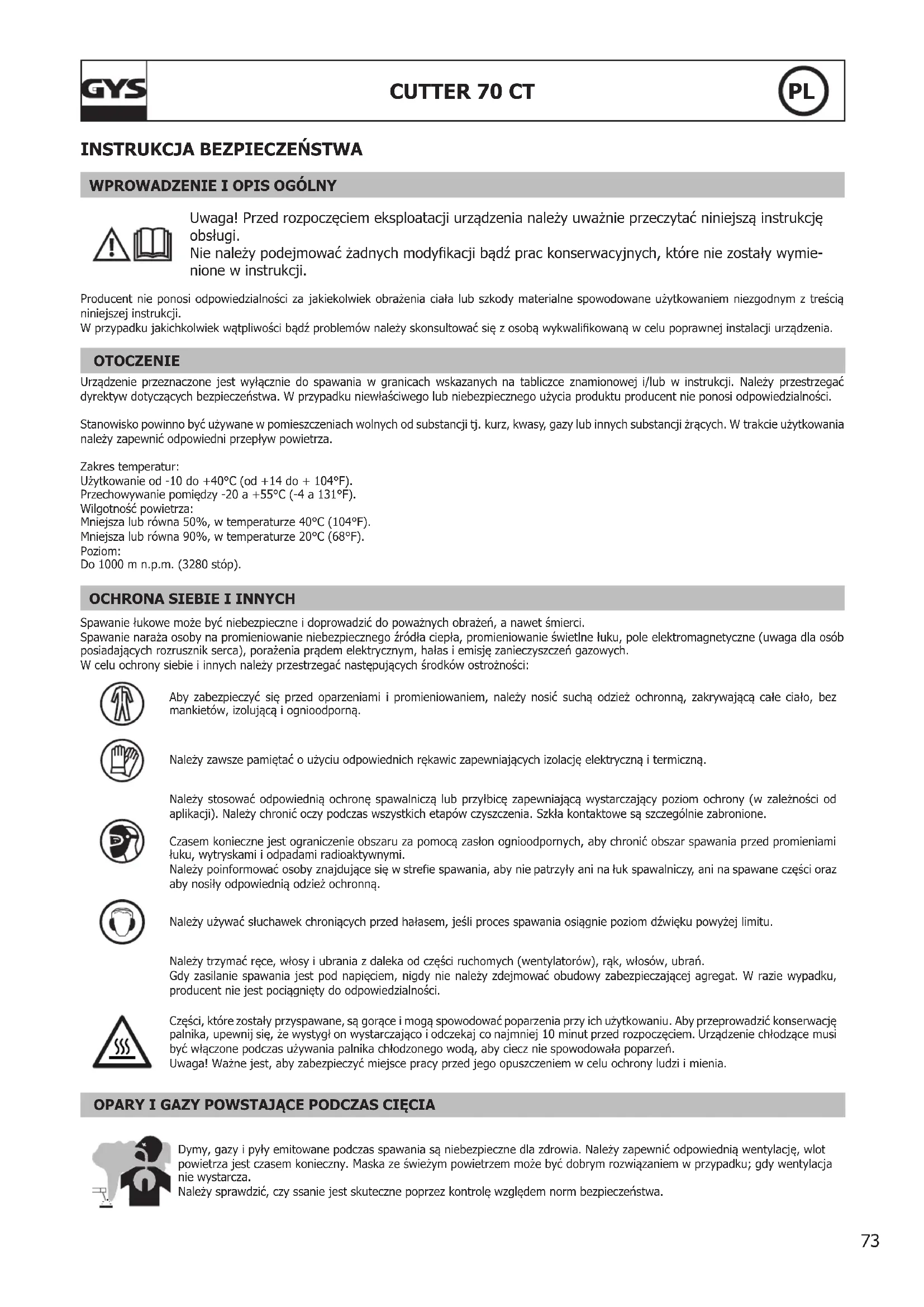 Spawanie łukowe może być niebezpieczne i doprowadzić do poważnych obrażeń, a nawet śmierci. Spawanie naraża osoby na promieniowanie niebezpiecznego źródła ciepła, promieniowanie świetlne łuku, pole elektromagnetyczne (uwaga dla osób posiadających rozrusznik serca), porażenia prądem elektrycznym, hałas i emisję zanieczyszczeń gazowych. W celu ochrony siebie i innych należy przestrzegać następujących środków ostrożności: Aby zabezpieczyć się przed oparzeniami i promieniowaniem, należy nosić suchą odzież ochronną, zakrywającą całe ciało, bez mankietów, izolującą i ognioodporną. Należy zawsze pamiętać o użyciu odpowiednich rękawic zapewniających izolację elektryczną i termiczną. Należy stosować odpowiednią ochronę spawalniczą lub przyłbicę zapewniającą wystarczający poziom ochrony (w zależności od aplikacji). Należy chronić oczy podczas wszystkich etapów czyszczenia. Szkła kontaktowe są szczególnie zabronione. Czasem konieczne jest ograniczenie obszaru za pomocą zasłon ognioodpornych, aby chronić obszar spawania przed promieniami łuku, wytryskami i odpadami radioaktywnymi. Należy poinformować osoby znajdujące się w stree spawania, aby nie patrzyły ani na łuk spawalniczy, ani na spawane części oraz aby nosiły odpowiednią odzież ochronną. Należy używać słuchawek chroniących przed hałasem, jeśli proces spawania osiągnie poziom dźwięku powyżej limitu. Należy trzymać ręce, włosy i ubrania z daleka od części ruchomych (wentylatorów), rąk, włosów, ubrań. Gdy zasilanie spawania jest pod napięciem, nigdy nie należy zdejmować obudowy zabezpieczającej agregat. W razie wypadku, producent nie jest pociągnięty do odpowiedzialności. Części, które zostały przyspawane, są gorące i mogą spowodować poparzenia przy ich użytkowaniu. Aby przeprowadzić konserwację palnika, upewnij się, że wystygł on wystarczająco i odczekaj co najmniej 10 minut przed rozpoczęciem. Urządzenie chłodzące musi być włączone podczas używania palnika chłodzonego wodą, aby ciecz nie spowodowała poparzeń. Uwaga! Ważne jest, aby zabezpieczyć miejsce pracy przed jego opuszczeniem w celu ochrony ludzi i mienia. OPARY I GAZY POWSTAJĄCE PODCZAS CIĘCIA Dymy, gazy i pyły emitowane podczas spawania są niebezpieczne dla zdrowia. Należy zapewnić odpowiednią wentylację, wlot powietrza jest czasem konieczny. Maska ze świeżym powietrzem może być dobrym rozwiązaniem w przypadku; gdy wentylacja nie wystarcza. Należy sprawdzić, czy ssanie jest skuteczne poprzez kontrolę względem norm bezpieczeństwa.74 CUTTER 70 CT
