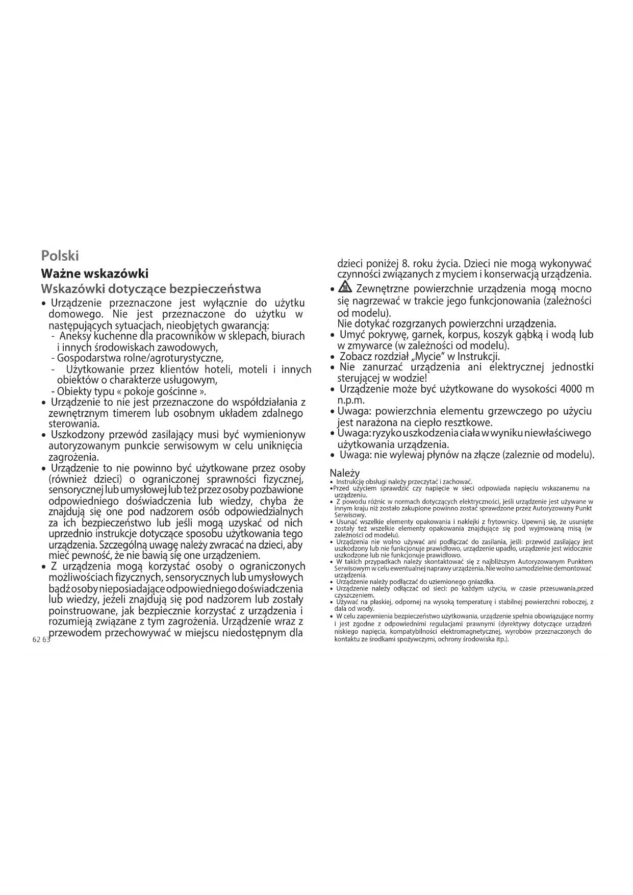 - Instrukcję obsługi należy przeczytać i zachować.• Przed użyciem sprawdzić czy napięcie w sieci odpowiada napięciu wskazanemu na urządzeniu.• Z powodu różnic w normach dotyczących elektryczności, jeśli urządzenie jest używane w innym kraju niż zostało zakupione powinno zostać sprawdzone przez Autoryzowany Punkt Serwisowy.• Usunąć wszelkie elementy opakowania i naklejki z frytownicy. Upewnij się, że usunięte zostały też wszelkie elementy opakowania znajdujące się pod wyjmowaną misą (w zależności od modelu).• Urządzenia nie wolno używać ani podłączać do zasilania, jeśli: przewód zasilający jest uszkodzony lub nie funkcjonuje prawidłowo, urządzenie upadło, urządzenie jest widocznie uszkodzone lub nie funkcjonuje prawidłowo.• W takich przypadkach należy skontaktować się z najbliższym Autoryzowanym Punktem Serwisowym w celu ewentualnej naprawy urządzenia. Nie wolno samodzielnie demontować urządzenia.• Urządzenie należy podłączać do uziemionego gniazdka.• Urządzenie należy odłączać od sieci: po każdym użyciu, w czasie przesuwania,przed czyszczeniem.• Używać na płaskiej, odpornej na wysoką temperaturę i stabilnej powierzchni roboczej, z dala od wody.• W celu zapewnienia bezpieczeństwo użytkowania, urządzenie spełnia obowiązujące normy i jest zgodne z odpowiednimi regulacjami prawnymi (dyrektywy dotyczące urządzeń niskiego napięcia, kompatybilności elektromagnetycznej, wyrobów przeznaczonych do kontaktu ze środkami spożywczymi, ochrony środowiska itp.).64 65