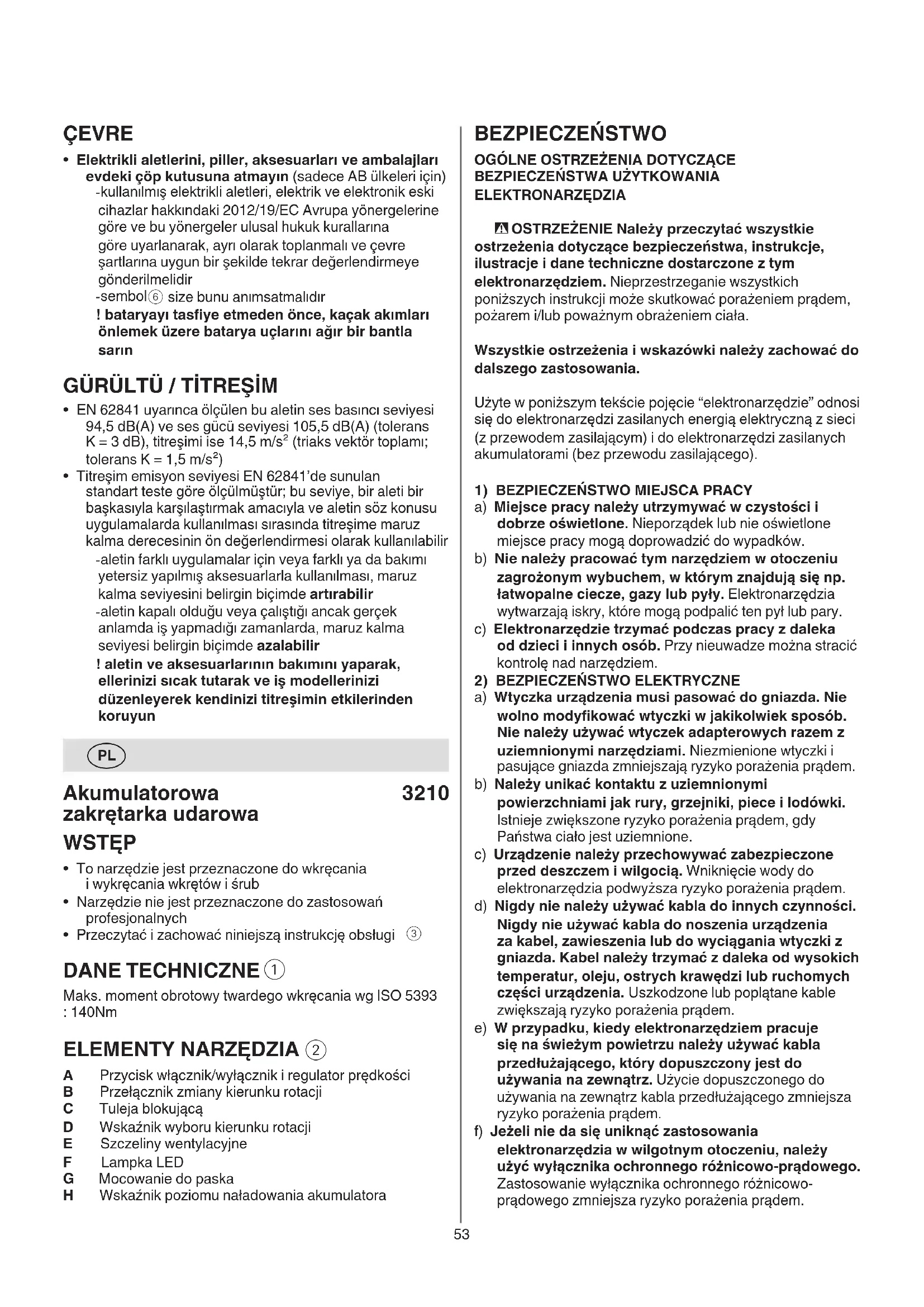 ELEKTRONARZĘDZIA - OSTRZEŻENIE Należy przeczytać wszystkie ostrzeżenia dotyczące bezpieczeństwa, instrukcje, ilustracje i dane techniczne dostarczone z tym elektronarzędziem. Nieprzestrzeganie wszystkich poniższych instrukcji może skutkować porażeniem prądem, pożarem i/lub poważnym obrażeniem ciała. Wszystkie ostrzeżenia i wskazówki należy zachować do dalszego zastosowania. Użyte w poniższym tekście pojęcie “elektronarzędzie” odnosi się do elektronarzędzi zasilanych energią elektryczną z sieci (z przewodem zasilającym) i do elektronarzędzi zasilanych akumulatorami (bez przewodu zasilającego).