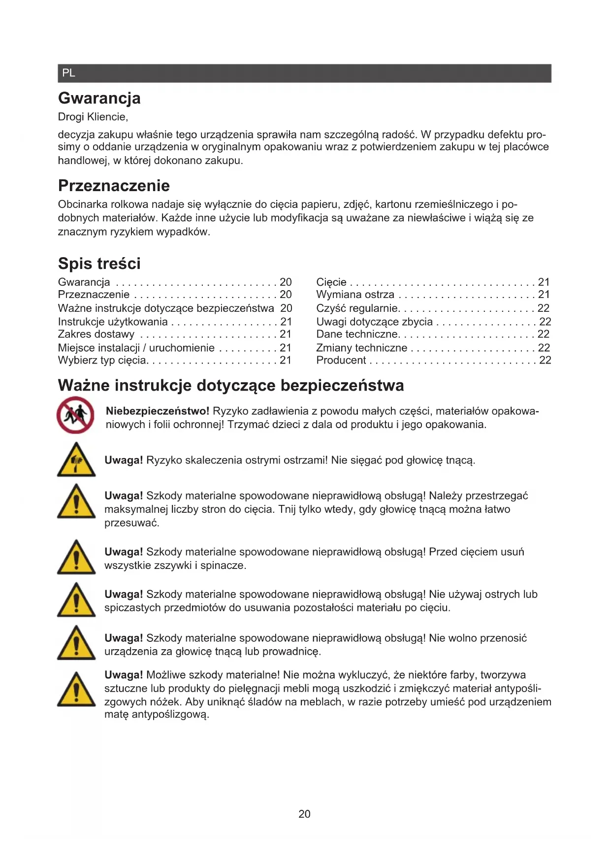 - Gwarancja Drogi Kliencie, decyzja zakupu właśnie tego urządzenia sprawiła nam szczególną radość. W przypadku defektu pro- simy o oddanie urządzenia w oryginalnym opakowaniu wraz z potwierdzeniem zakupu w tej placówce handlowej, w której dokonano zakupu. Przeznaczenie Obcinarka rolkowa nadaje się wyłącznie do cięcia papieru, zdjęć, kartonu rzemieślniczego i po- dobnych materiałów. Każde inne użycie lub modykacja są uważane za niewłaściwe i wiążą się ze znacznym ryzykiem wypadków. Spis treści Gwarancja p. 20