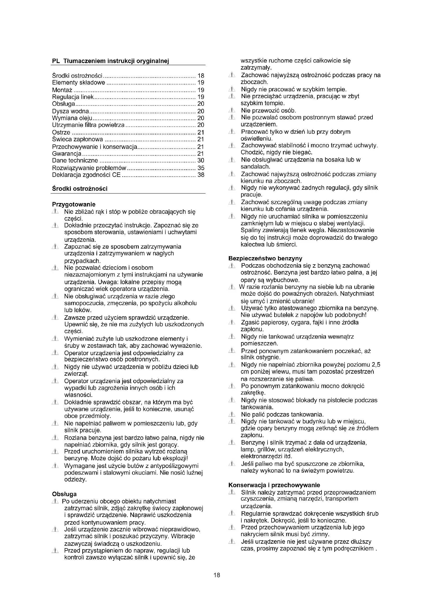 1 Nigdy nie uruchamiać silnika w pomieszczeniu zamknietym lub w.),..., Spaliny zawieraja tlenek węgla. Niezastosowanie są do tej instrukcji要去 doprowadzić do trwało kalectwa lub smierci.