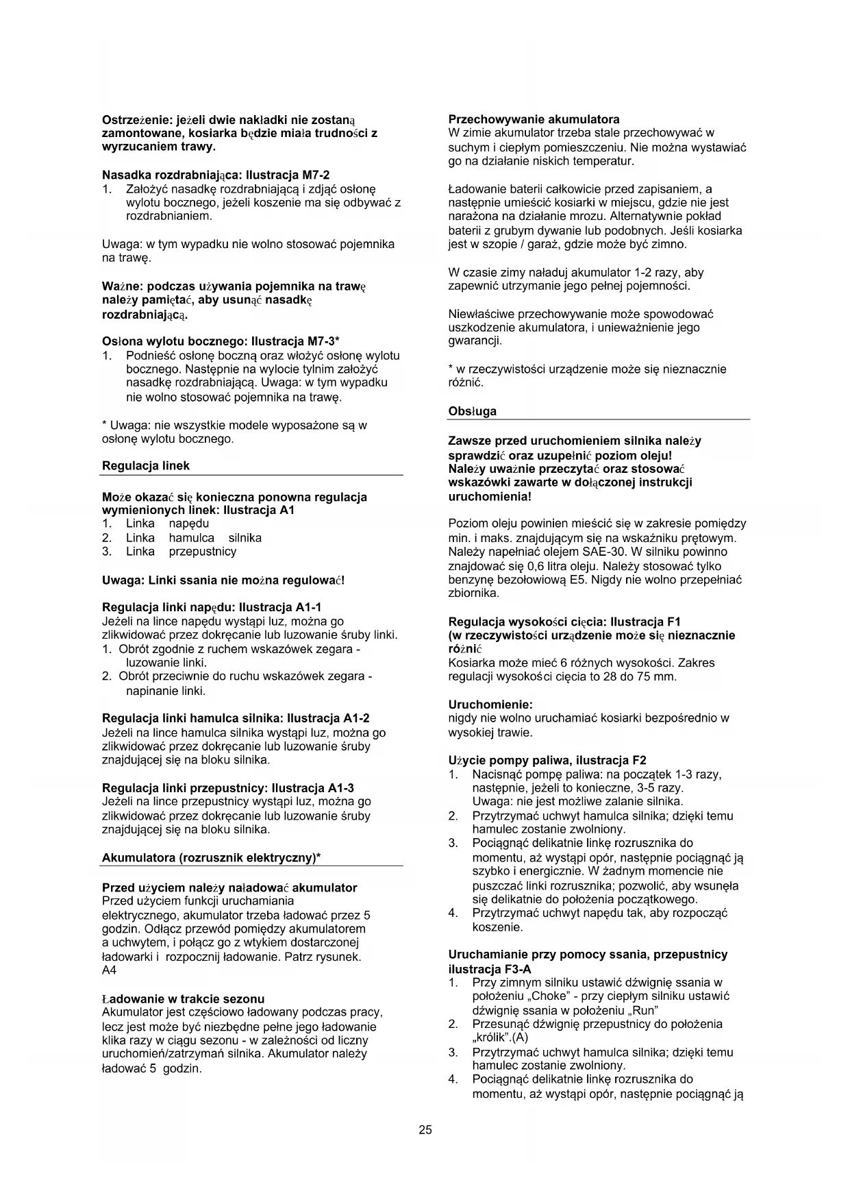 - Deklaracja zgodności EU Środki ostrożności Przygotowanie Nie zbliżać rąk i stóp w pobliże obracających się części. Dokładnie przeczytać instrukcje. Zapoznać się ze sposobem sterowania, ustawieniami i uchwytami urządzenia. Zapoznać się ze sposobem zatrzymywania urządzenia i zatrzymywaniem w nagłych przypadkach. Nie pozwalać dzieciom i osobom niezaznajomionym z tymi instrukcjami na używanie urządzenia. Uwaga: lokalne przepisy mogą ograniczać wiek operatora urządzenia. Nie obsługiwać urządzenia w razie złego samopoczucia, zmęczenia, po spożyciu alkoholu lub leków. Zawsze przed użyciem sprawdzić urządzenie. Upewnić się, że nie ma zużytych lub uszkodzonych części. Wymieniać zużyte lub uszkodzone elementy i śruby w zestawach tak, aby zachować wyważenie. Operator urządzenia jest odpowiedzialny za bezpieczeństwo osób postronnych. Nigdy nie używać urządzenia w pobliżu dzieci lub zwierząt. Operator urządzenia jest odpowiedzialny za wypadki lub zagrożenia innych osób i ich własności. Dokładnie sprawdzić obszar, na którym ma być używane urządzenie, jeśli to konieczne, usunąć obce przedmioty. Nie napełniać paliwem w pomieszczeniu lub, gdy silnik pracuje. Rozlana benzyna jest bardzo łatwo palna, nigdy nie napełniać zbiornika, gdy silnik jest gorący. Przed uruchomieniem silnika wytrzeć rozlaną benzynę. Może dojść do pożaru lub eksplozji! Wymagane jest użycie butów z antypoślizgowymi podeszwami i stalowymi okuciami. Nie nosić luźnej odzieży. Obsługa Po uderzeniu obcego obiektu natychmiast zatrzymać silnik, zdjąć zakrętkę świecy zapłonowej i sprawdzić urządzenie. Naprawić uszkodzenia przed kontynuowaniem pracy. Jeśli urządzenie zacznie wibrować nieprawidłowo, zatrzymać silnik i poszukać przyczyny. Wibracje zazwyczaj świadczą o uszkodzeniu. Przed przystąpieniem do napraw, regulacji lub kontroli zawsze wyłączać silnik i upewnić się, że wszystkie ruchome części całkowicie się zatrzymały. Zachować najwyższą ostrożność podczas pracy na zboczach. Nigdy nie pracować w szybkim tempie. Nie przeciążać urządzenia, pracując w zbyt szybkim tempie. Nie przewozić osób. Nie pozwalać osobom postronnym stawać przed urządzeniem. Pracować tylko w dzień lub przy dobrym oświetleniu. Zachowywać stabilność i mocno trzymać uchwyty. Chodzić, nigdy nie biegać. Nie obsługiwać urządzenia na bosaka lub w sandałach. Zachować najwyższą ostrożność podczas zmiany kierunku na zboczach. Nigdy nie wykonywać żadnych regulacji, gdy silnik pracuje. Zachować szczególną uwagę podczas zmiany kierunku lub cofania urządzenia. Nigdy nie uruchamiać silnika w pomieszczeniu zamkniętym lub w miejscu o słabej wentylacji. Spaliny zawierają tlenek węgla. Niezastosowanie się do tej instrukcji może doprowadzić do trwałego kalectwa lub śmierci. Bezpieczeństwo benzyny Podczas obchodzenia się z benzyną zachować ostrożność. Benzyna jest bardzo łatwo palna, a jej opary są wybuchowe. W razie rozlania benzyny na siebie lub na ubranie może dojść do poważnych obrażeń. Natychmiast się umyć i zmienić ubranie! Używać tylko atestowanego zbiornika na benzynę. Nie używać butelek z napojów lub podobnych! Zgasić papierosy, cygara, fajki i inne źródła zapłonu. Nigdy nie tankować urządzenia wewnątrz pomieszczeń. Przed ponownym zatankowaniem poczekać, aż silnik ostygnie. Nigdy nie napełniać zbiornika powyżej poziomu 2,5 cm poniżej wlewu, musi tam pozostać przestrzeń na rozszerzanie się paliwa. Po ponownym zatankowaniu mocno dokręcić zakrętkę. Nigdy nie stosować blokady na pistolecie podczas tankowania. Nie palić podczas tankowania. Nigdy nie tankować w budynku lub w miejscu, gdzie opary benzyny mogą zetknąć się ze źródłem zapłonu. Benzynę i silnik trzymać z dala od urządzenia, lamp, grillów, urządzeń elektrycznych, elektronarzędzi itd. Jeśli paliwo ma być spuszczone ze zbiornika, należy wykonać to na świeżym powietrzu. Konserwacja i przechowywanie Silnik należy zatrzymać przed przeprowadzaniem czyszczenia, zmianą narzędzi, transportem urządzenia. Regularnie sprawdzać dokręcenie wszystkich śrub i nakrętek. Dokręcić, jeśli to konieczne. Przed przechowywaniem urządzenia lub jego nakryciem silnik musi być zimny.loading-circle-125 Ostrzeżenie: jeżeli dwie nakładki nie zostaną zamontowane, kosiarka będzie miała trudności z wyrzucaniem trawy. Nasadka rozdrabniająca: Ilustracja M7-2 p. 71