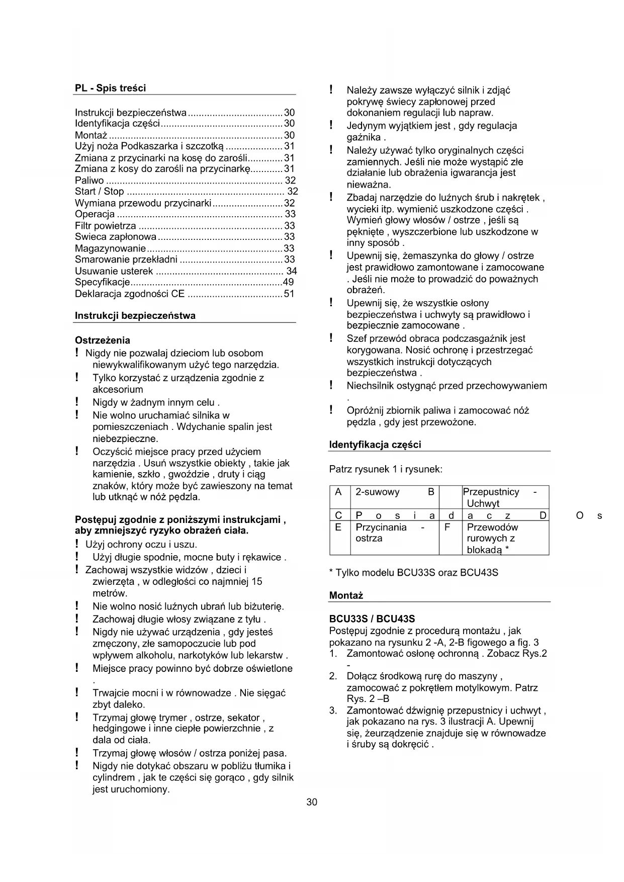 ! Trwajcie mocni i w równowadze . Nie sięgać zbyt daleko. ! Trzymaj głowę trymer , ostrze, sekator , hedgingowe i inne ciepłe powierzchnie , z dala od ciała. ! Trzymaj głowę włosów / ostrza poniżej pasa. ! Nigdy nie dotykać obszaru w pobliżu tłumika i cylindrem , jak te części się gorąco , gdy silnik jest uruchomiony. ! Należy zawsze wyłączyć silnik i zdjąć pokrywę świecy zapłonowej przed dokonaniem regulacji lub napraw. ! Jedynym wyjątkiem jest , gdy regulacja gaźnika . ! Należy używać tylko oryginalnych części zamiennych. Jeśli nie może wystąpić złe działanie lub obrażenia igwarancja jest nieważna. ! Zbadaj narzędzie do luźnych śrub i nakrętek , wycieki itp. wymienić uszkodzone części . Wymień głowy włosów / ostrze , jeśli są pęknięte , wyszczerbione lub uszkodzone w inny sposób . ! Upewnij się, żemaszynka do głowy / ostrze jest prawidłowo zamontowane i zamocowane . Jeśli nie może to prowadzić do poważnych obrażeń. ! Upewnij się, że wszystkie osłony bezpieczeństwa i uchwyty są prawidłowo i bezpiecznie zamocowane . ! Szef przewód obraca podczasgaźnik jest korygowana. Nosić ochronę i przestrzegać wszystkich instrukcji dotyczących bezpieczeństwa . ! Niechsilnik ostygnąć przed przechowywaniem