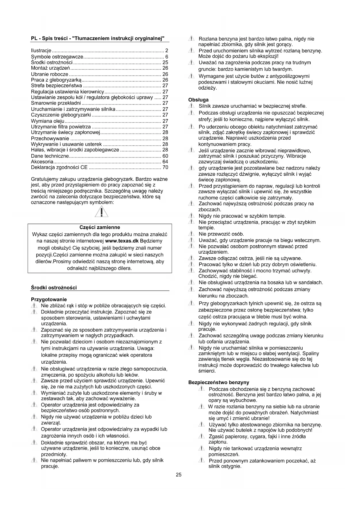 - Deklaracja zgodności CE Gratulujemy zakupu urządzenia glebogryzark. Bardzo ważne jest, aby przed przystąpieniem do pracy zapoznać się z treścią niniejszego podręcznika. Szczególną uwagę należy zwrócić na zalecenia dotyczące bezpieczeństwa, które są oznaczone następującym symbolem: p. 70