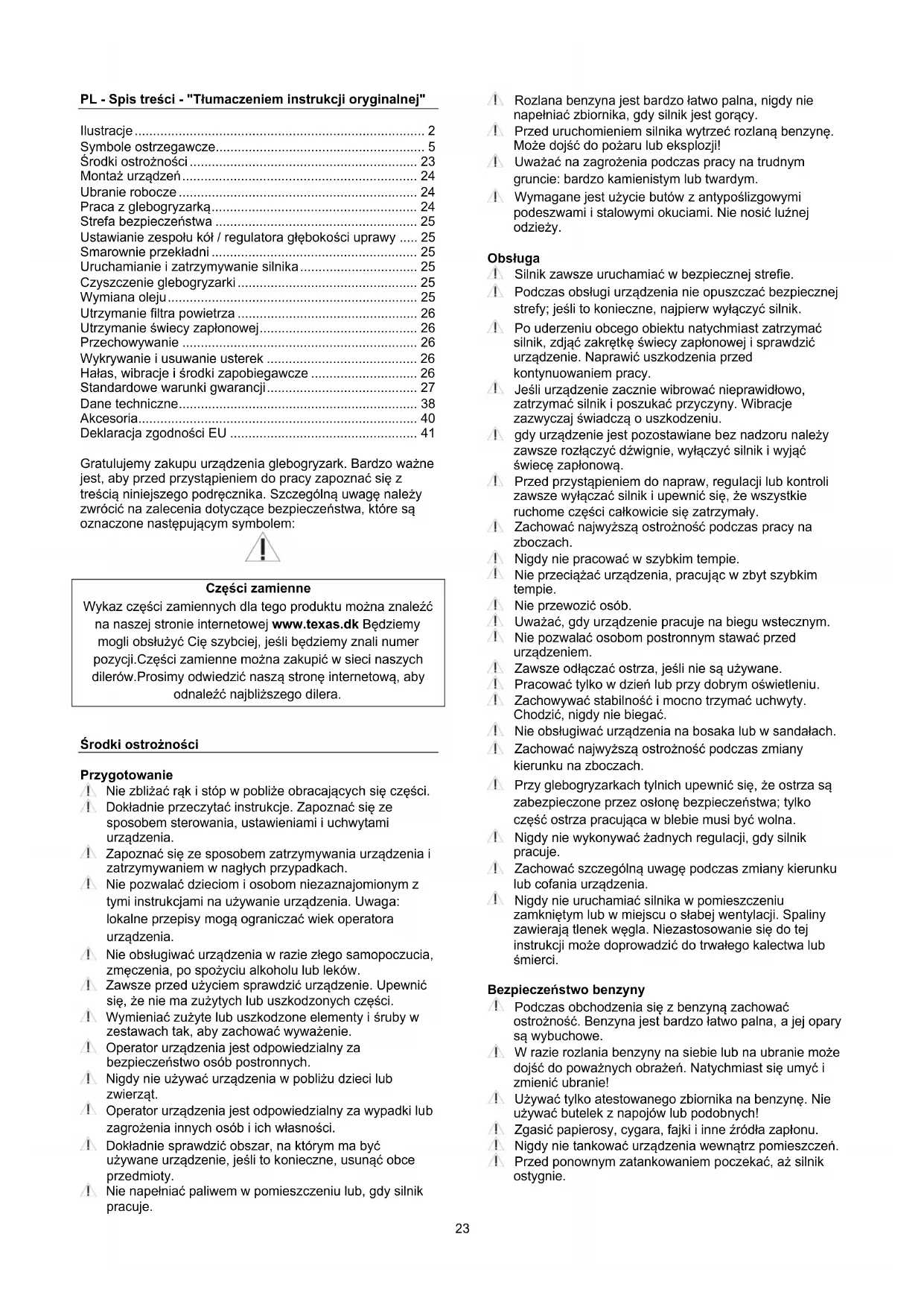 - Deklaracja zgodności EU Gratulujemy zakupu urządzenia glebogryzark. Bardzo ważne jest, aby przed przystąpieniem do pracy zapoznać się z treścią niniejszego podręcznika. Szczególną uwagę należy zwrócić na zalecenia dotyczące bezpieczeństwa, które są oznaczone następującym symbolem: p. 41