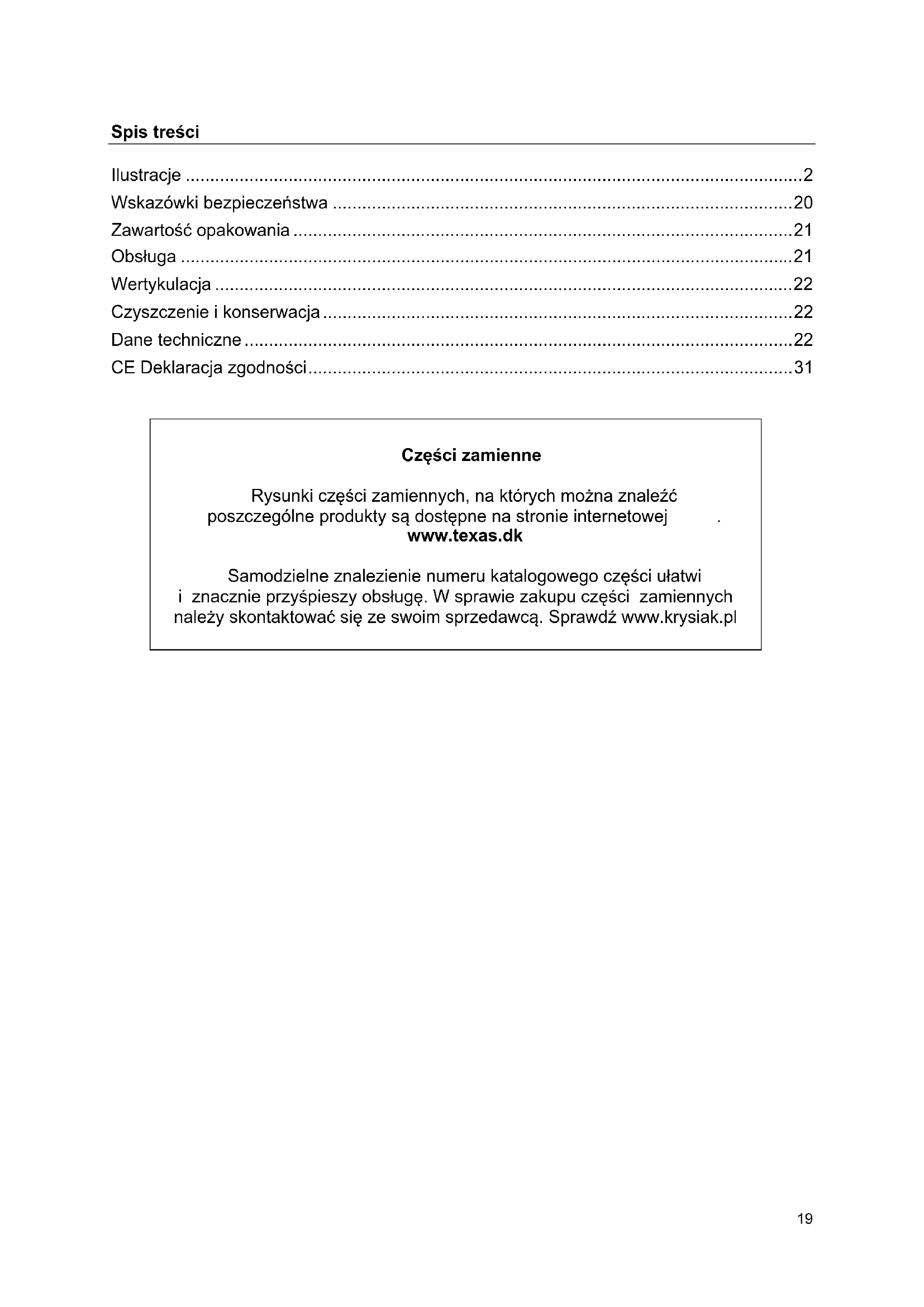 Części zamienne Rysunki części zamiennych, na których można znaleźć poszczególne produkty są dostępne na stronie internetowej . www.texas.dk Samodzielne znalezienie numeru katalogowego części ułatwi i znacznie przyśpieszy obsługę. W sprawie zakupu części zamiennych należy skontaktować się ze swoim sprzedawcą. Sprawdź www.krysiak.pl20 Wskazówki bezpieczeństwa Przepisy bezpieczeństwa muszą być ściśle stosowane podczas użytkowania wertykulatora. Należy dokładnie zaznajomić się z niniejszą instrukcją przed uruchomieniem urządzenia. Upewnić się czy można natychmiast wyłączyć urządzenie i silnik w razie wypadku. Wszystkie przepisy bezpieczeństwa i konserwacji wertykulatora służą do zapewnienia osobistego bezpieczeństwa obsługującego. Wertykulator nie może być używany do innych celów niż opisane w tej instrukcji. Należy używać tylko oryginalnych akcesoriów i części zamiennych. Zamontowanie części niewiadomego pochodzenia zwiększa ryzyko pojawienia się problemów i dlatego nie jest dozwolone. Producent nie ponosi odpowiedzialności za szkody i obrażenia będące w